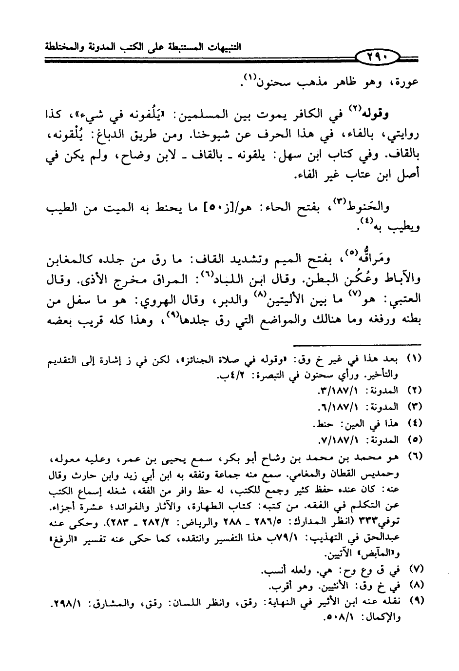 (¬6) هو محمد بن محمد بن وشاح أبو بكر، سمع يحيى بن عمر، وعليه معوله، وحمديس القطان والمغامي. سمع منه جماعة وتفقه به ابن أبي زيد وابن حارث وقال عنه: كان عنده حفظ كثير وجمع للكتب، له حظ وافر من الفقه، شغله إسماع الكتب عن التكلم في الفقه. من كتبه: كتاب الطهارة، والآثار والفوائد؛ عشرة أجزاء. توفي 333 (انظر المدارك: 5/ 286 - 288 والرياض: 2/ 282 - 283). وحكى عنه عبد الحق في التهذيب: 1/ 79 ب هذا التفسير وانتقده، كما حكى عنه تفسير "الرفغ" و"المآبض" الآتيين.