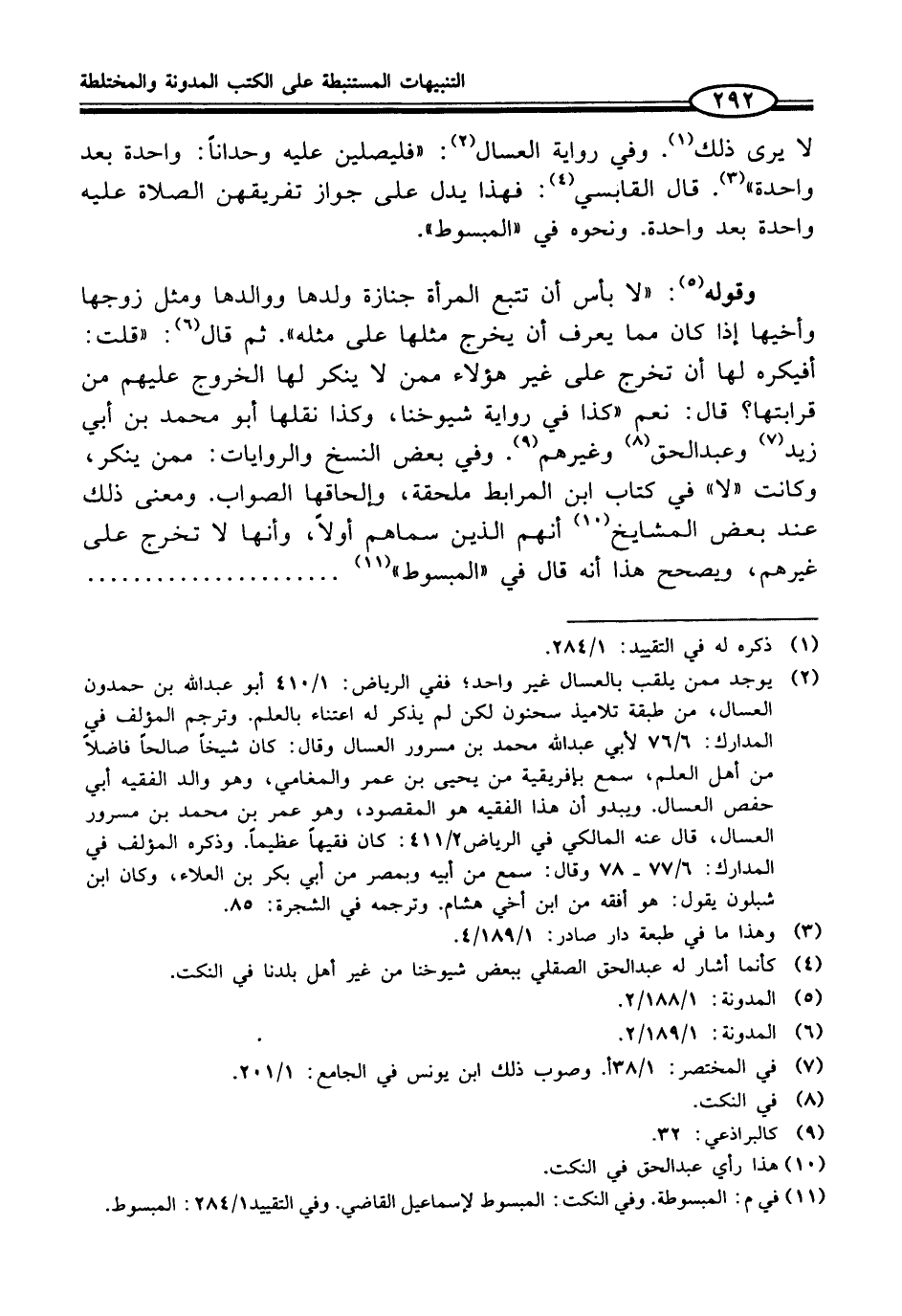 وقوله (¬5): "لا بأس أن تتبع المرأة جنازة ولدها ووالدها ومثل زوجها وأخيها إذا كان مما يعرف أن يخرج مثلها على مثله". ثم قال (¬6): "قلت: أفيكره لها أن تخرج على غير هؤلاء ممن لا ينكر لها الخروج عليهم من قرابتها؟ قال: نعم "كذا في رواية شيوخنا، وكذا نقلها أبو محمَّد بن أبي زيد (¬7) وعبد الحق (¬8) وغيرهم (¬9). وفي بعض النسخ والروايات: ممن ينكر، وكانت "لا" في كتاب ابن المرابط ملحقة، وإلحاقها الصواب. ومعنى ذلك عند بعض المشايخ (¬10) أنهم الذين سماهم أولاً، وأنها لا تخرج على غيرهم، ويصحح هذا أنه قال في "المبسوط" (¬11) ..................