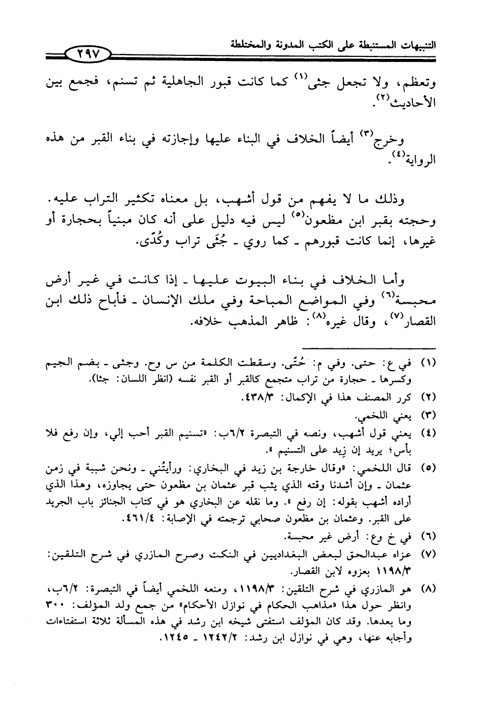 (¬5) قال اللخمي: "وقال خارجة بن زيد في البخاري: ورأيتُني - ونحن شببة في زمن عثمان - وإن أشدنا وقته الذي يثب قبر عثمان بن مظعون حتى يجاوزه، وهذا الذي أراده أشهب بقوله: إن رفع". وما نقله عن البخاري هو في كتاب الجنائز باب الجريد على القبر. وعثمان بن مظعون صحابي ترجمته في الإصابة: 4/ 461.