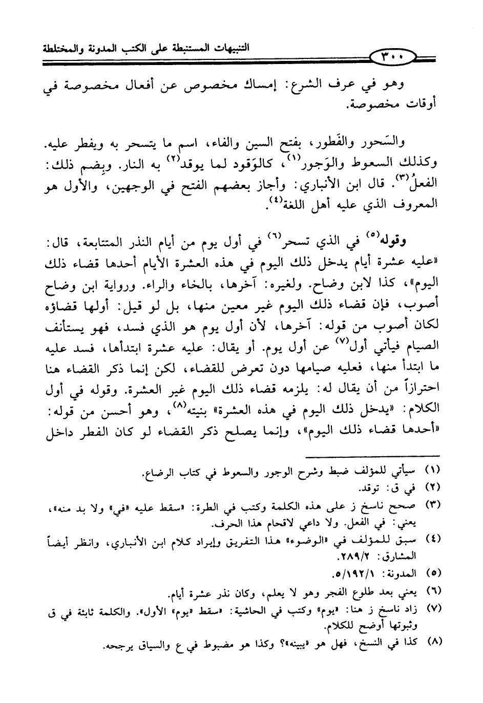 وقوله (¬5) في الذي تسحر (¬6) في أول يوم من أيام النذر المتتابعة، قال: "عليه عشرة أيام يدخل ذلك اليوم في هذه العشرة الأيام أحدها قضاء ذلك اليوم"، كذا لابن وضاح. ولغيره: آخرها، بالخاء والراء. ورواية ابن وضاح أصوب، فإن قضاء ذلك اليوم غير معين منها، بل لو قيل: أولها قضاؤه لكان أصوب من قوله: آخرها, لأن أول يوم هو الذي فسد، فهو يستأنف الصيام فيأتي أول (¬7) عن أول يوم. أو يقال: عليه عشرة ابتدأها، فسد عليه ما ابتدأ منها، فعليه صيامها دون تعرض للقضاء، لكن إنما ذكر القضاء هنا احترازاً من أن يقال له: يلزمه قضاء ذلك اليوم غير العشرة. وقوله في أول الكلام: "يدخل ذلك اليوم في هذه العشرة" بنيته (¬8)، وهو أحسن من قوله: "أحدها قضاء ذلك اليوم"، وإنما يصلح ذكر القضاء لو كان الفطر داخل