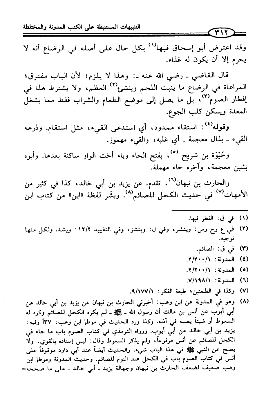 (¬8) وهو في المدونة عن ابن وهب: أخبرني الحارث بن نبهان عن يزيد بن أبي خالد عن أبي أيوب عن أنس بن مالك أن رسول الله - صلى الله عليه وسلم - لم يكره الكحل للصائم وكره له السعوط أو شيئاً يصبه في أذنه. وكذا ورد الحديث في موطإ ابن وهب: 37 أوفيه: يزيد بن أبي خالد عن أبي أيوب. ورواه الترمذي في كتاب الصوم باب ما جاء في الكحل للصائم عن أنس مرفوعاً، ولم يذكر السعوط وقال: ليس إسناده بالقوي، ولا يصح عن النبي - صلى الله عليه وسلم - في هذا الباب شيء. والحديث أيضاً عند أبي داود موقوفاً على أنس في كتاب الصوم باب في الكحل عند النوم للصائم. وحديث المدونة وموطإ ابن وهب ضعيف لضعف الحارث بن نبهان وجهالة يزيد - أبي خالد - على ما صححه =