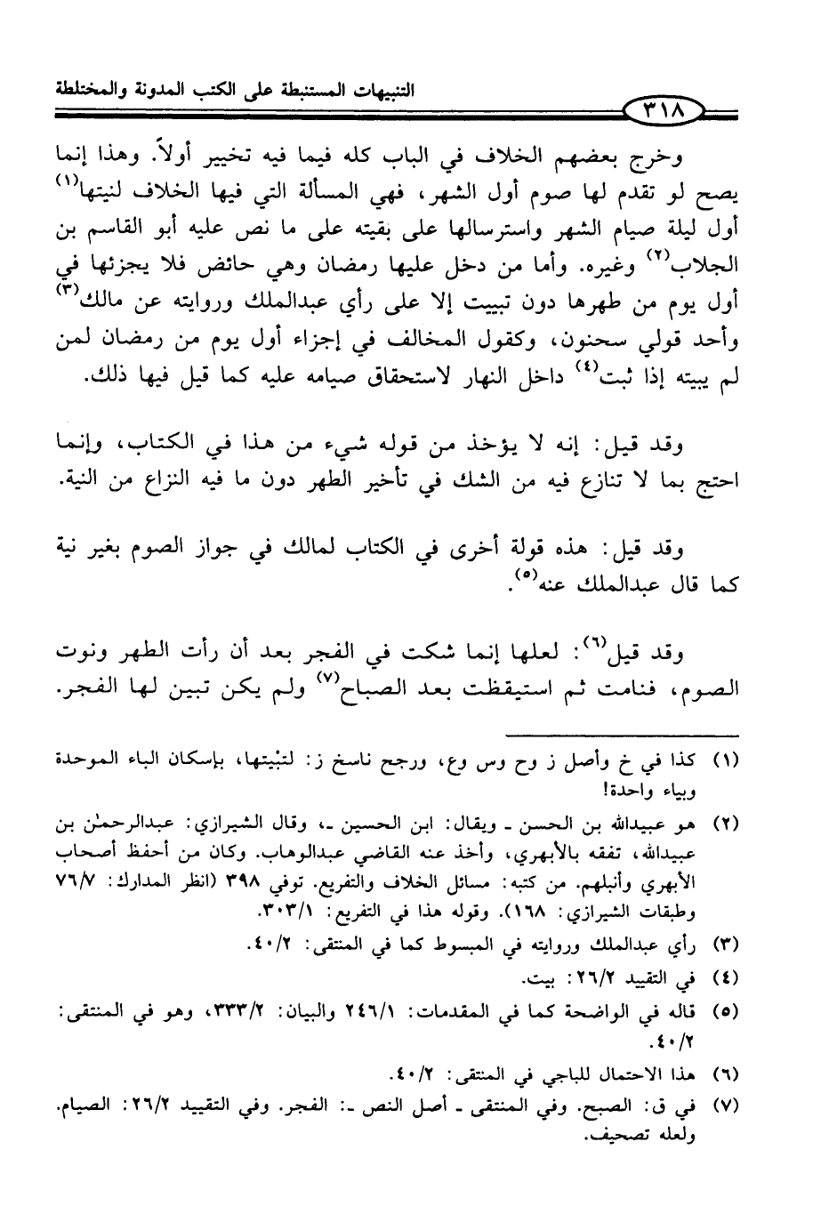 (¬2) هو عبيد الله بن الحسن - ويقال: ابن الحسين -، وقال الشيرازي: عبد الرحمن بن عبيد الله، تفقه بالأبهري، وأخذ عنه القاضي عبد الوهاب. وكان من أحفظ أصحاب الأبهري وأنبلهم. من كتبه: مسائل الخلاف والتفريع. توفي 398 (انظر المدارك: 7/ 76 وطبقات الشيرازي: 168). وقوله هذا في التفريع: 1/ 303.