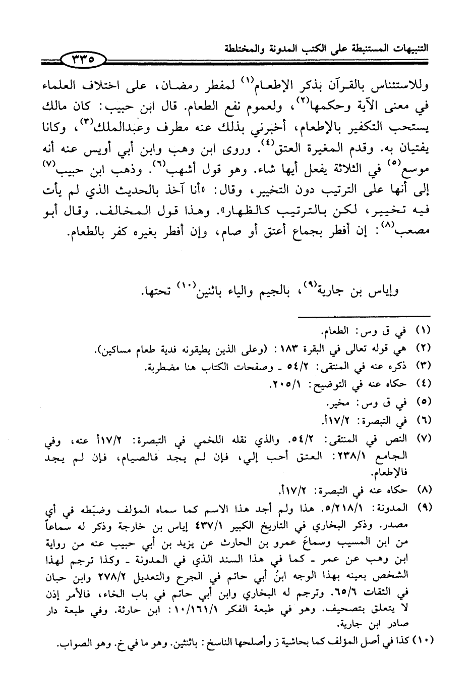 (¬9) المدونة: 1/ 218/ 5. هذا ولم أجد هذا الاسم كما سماه المؤلف وضبَطه في أي مصدر. وذكر البخاري في التاريخ الكبير 1/ 437 إياس بن خارجة وذكر له سماعاً من ابن المسيب وسماعَ عمرو بن الحارث عن يزيد بن أبي حبيب عنه من رواية ابن وهب عن عمر - كما في هذا السند الذي في المدونة - وكذا ترجم لهذا الشخص بعينه بهذا الوجه ابنُ أبي حاتم في الجرح والتعديل 2/ 278 وابن حبان في الثقات 6/ 65. وترجم له البخاري وابن أبي حاتم في باب الخاء، فالأمر إذن لا يتعلق بتصحيف. وهو في طبعة الفكر 1/ 161/ 10: ابن حارثة. وفي طبعة دار صادر ابن جارية.