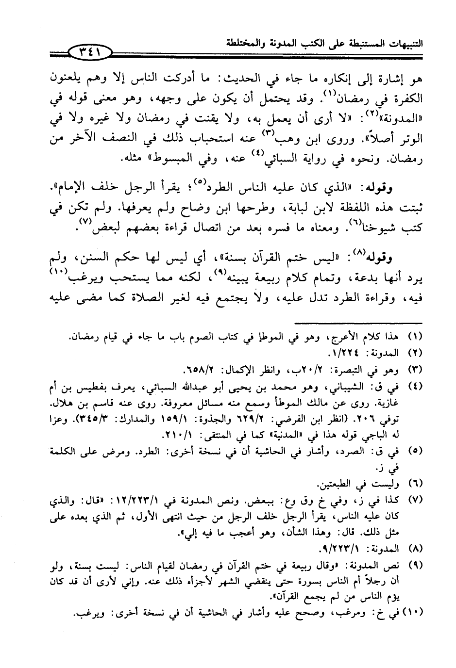 (¬9) نص المدونة: "وقال ربيعة في ختم القرآن في رمضان لقيام الناس: ليست بسنة، ولو أن رجلاً أم الناس بسورة حتى ينقضي الشهر لأجزأه ذلك عنه. وإني لأرى أن قد كان يؤم الناس من لم يجمع القرآن".