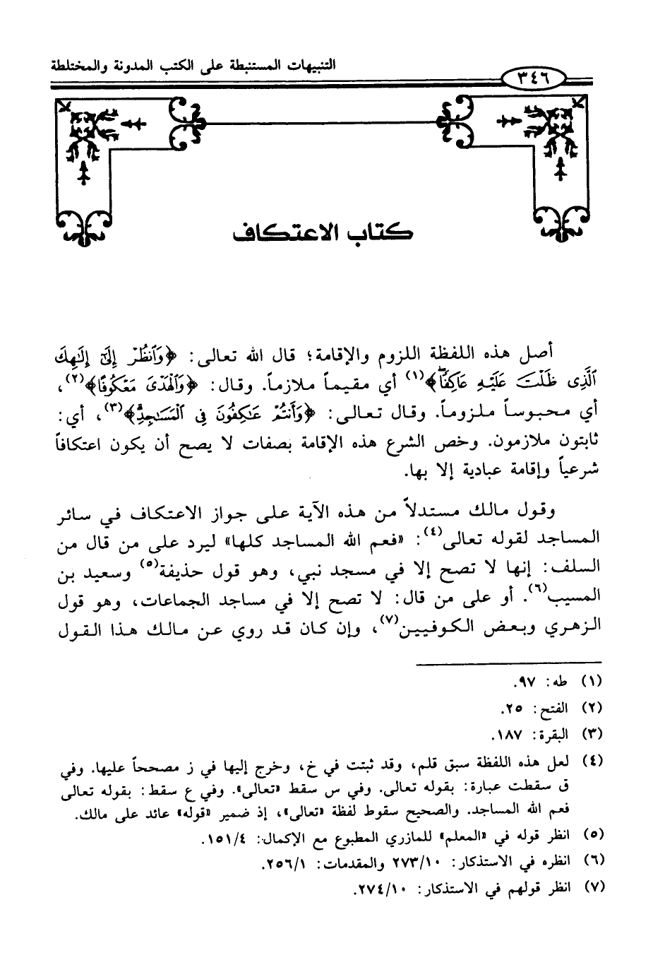 وقول مالك مستدلاً من هذه الآية على جواز الاعتكاف في سائر المساجد لقوله تعالى (¬4): "فعم الله المساجد كلها" ليرد على من قال من السلف: إنها لا تصح إلا في مسجد نبي، وهو قول حذيفة (¬5) وسعيد بن المسيب (¬6). أو على من قال: لا تصح إلا في مساجد الجماعات، وهو قول الزهري وبعض الكوفيين (¬7)، وإن كان قد روي عن مالك هذا القول
