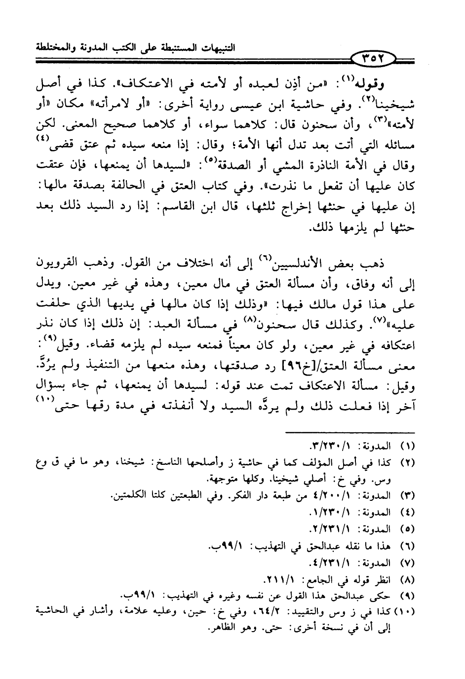 ذهب بعض الأندلسيين (¬6) إلى أنه اختلاف من القول. وذهب القرويون إلى أنه وفاق، وأن مسألة العتق في مال معين، وهذه في غير معين. ويدل على هذا قول مالك فيها: "وذلك إذا كان مالها في يديها الذي حلفت عليه" (¬7). وكذلك قال سحنون (¬8) في مسألة العبد: إن ذلك إذا كان نذر اعتكافه في غير معين، ولو كان معيناً فمنعه سيده لم يلزمه قضاء. وقيل (¬9): معنى مسألة العتق/ [خ 96] رد صدقتها، وهذه منعها من التنفيذ ولم يرُدَّ. وقيل: مسألة الاعتكاف تمت عند قوله: لسيدها أن يمنعها، ثم جاء بسؤال آخر إذا فعلت ذلك ولم يردَّه السيد ولا أنفذته في مدة رقها حتى (¬10)