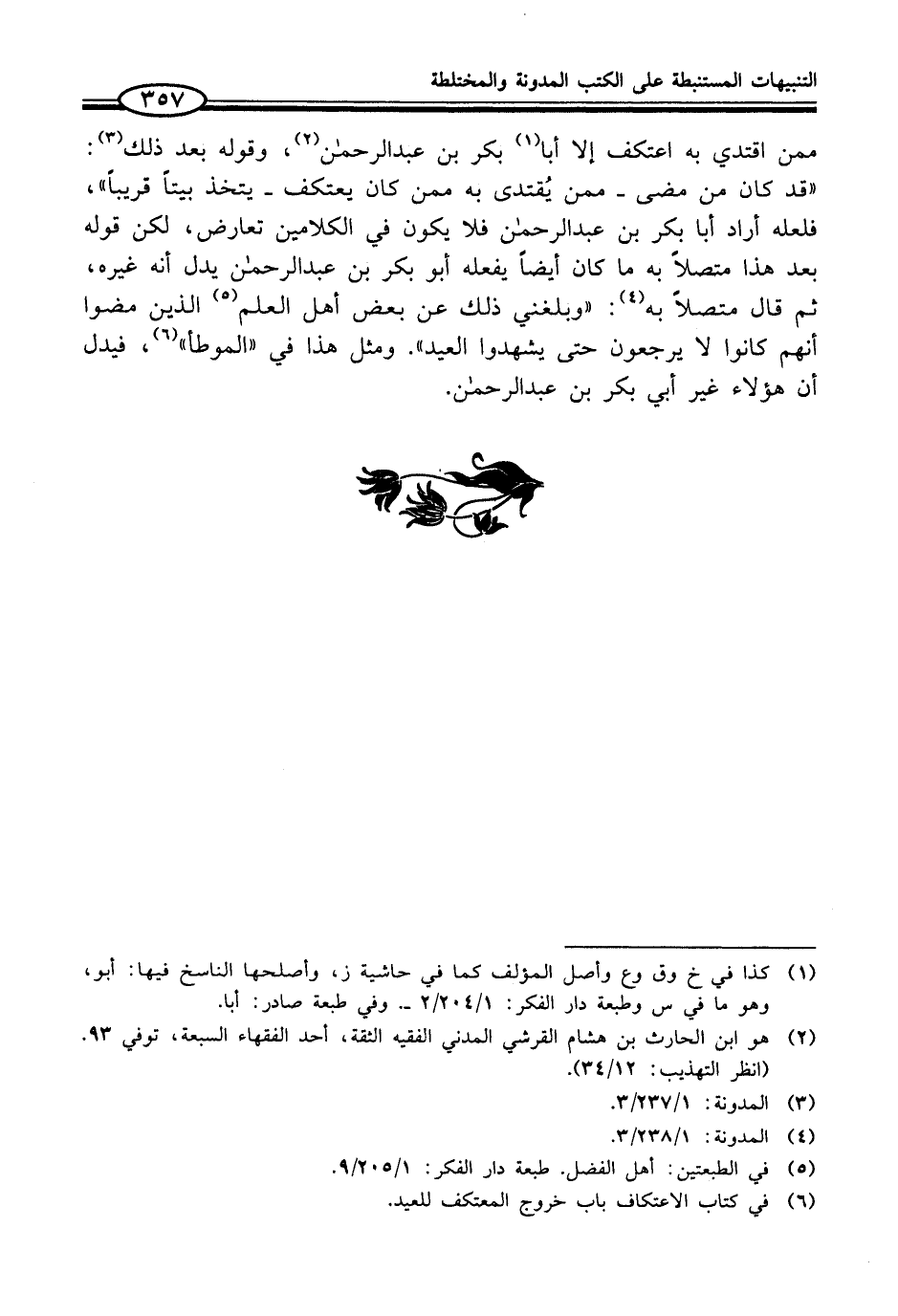 ممن اقتدي به اعتكف إلا أبا (¬1) بكر بن عبد الرحمن (¬2)، وقوله بعد ذلك (¬3): "قد كان من مضى - ممن يُقتدى به ممن كان يعتكف - يتخذ بيتاً قريباً"، فلعله أراد أبا بكر بن عبد الرحمن فلا يكون في الكلامين تعارض، لكن قوله بعد هذا متصلاً به ما كان أيضاً يفعله أبو بكر بن عبد الرحمن يدل أنه غيره، ثم قال متصلاً به (¬4): "وبلغني ذلك عن بعض أهل العلم (¬5) الذين مضوا أنهم كانوا لا يرجعون حتى يشهدوا العيد". ومثل هذا في "الموطأ" (¬6)، فيدل أن هؤلاء غير أبي بكر بن عبد الرحمن.