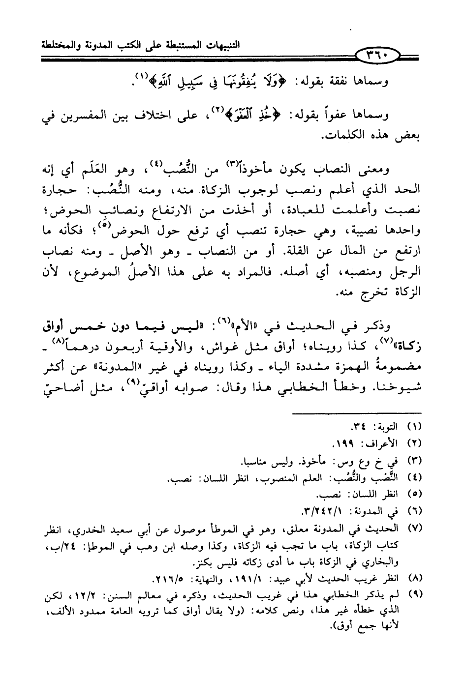 (¬7) الحديث في المدونة معلق، وهو في الموطأ موصول عن أبي سعيد الخدري، انظر كتاب الزكاة، باب ما تجب فيه الزكاة، وكذا وصله ابن وهب في الموطإ: 24/ ب، والبخاري في الزكاة باب ما أدى زكاته فليس بكنز.