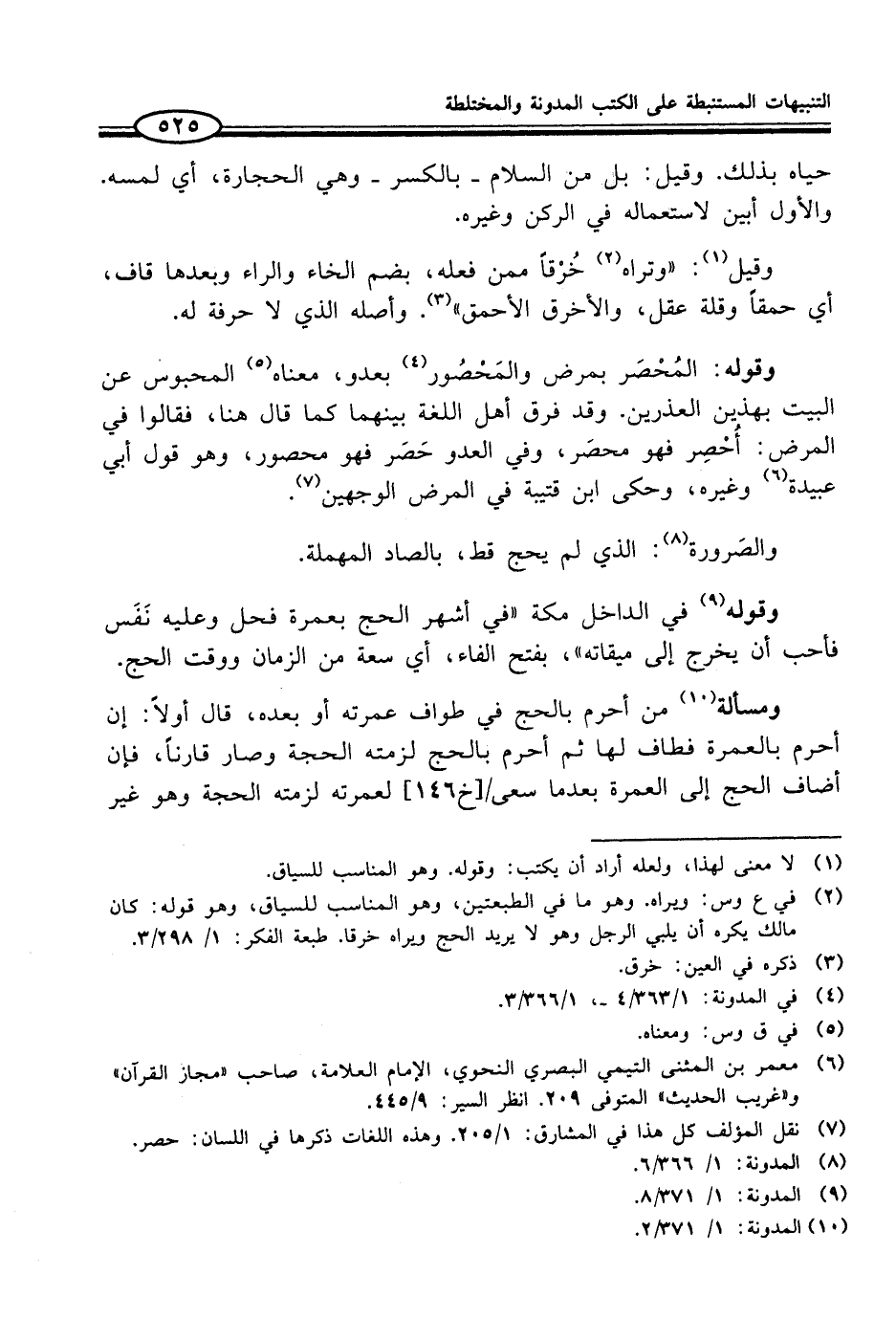وقوله: المُحْصَر بمرض والمَحْصُور (¬4) بعدو، معناه (¬5) المحبوس عن البيت بهذين العذرين. وقد فرق أهل اللغة بينهما كما قال هنا، فقالوا في المرض: أُحْصِر فهو محصَر، وفي العدو حَصَر فهو محصور، وهو قول أبي عبيدة (¬6) وغيره، وحكى ابن قتيبة في المرض الوجهين (¬7).