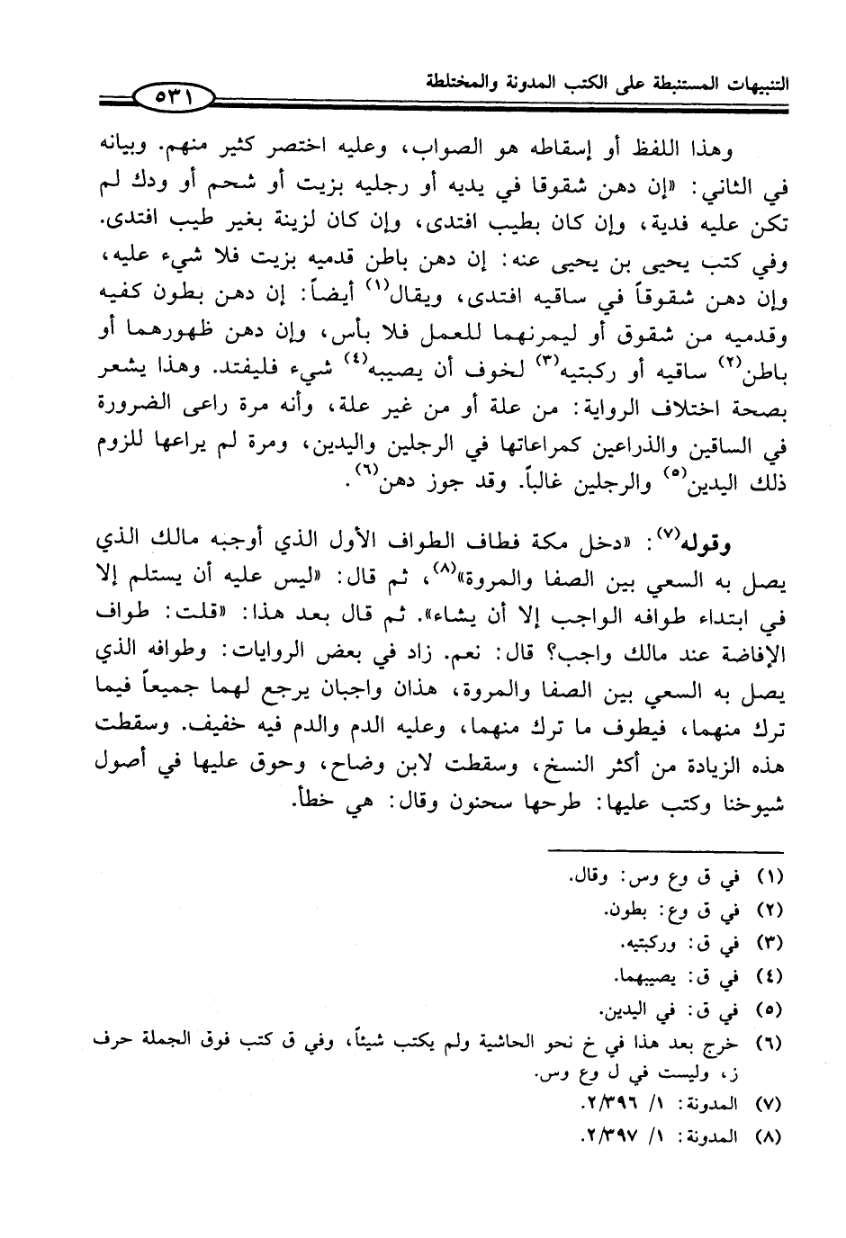 وقوله (¬7): "دخل مكة فطاف الطواف الأول الذي أوجبه مالك الذي يصل به السعي بين الصفا والمروة" (¬8)، ثم قال: "ليس عليه أن يستلم إلا في ابتداء طوافه الواجب إلا أن يشاء". ثم قال بعد هذا: "قلت: طواف الإفاضة عند مالك واجب؟ قال: نعم. زاد في بعض الروايات: وطوافه الذي يصل به السعي بين الصفا والمروة، هذان واجبان يرجع لهما جميعاً فيما ترك منهما، فيطوف ما ترك منهما، وعليه الدم والدم فيه خفيف. وسقطت هذه الزيادة من أكثر النسخ، وسقطت لابن وضاح، وحوق عليها في أصول شيوخنا وكتب عليها: طرحها سحنون وقال: هي خطأ.