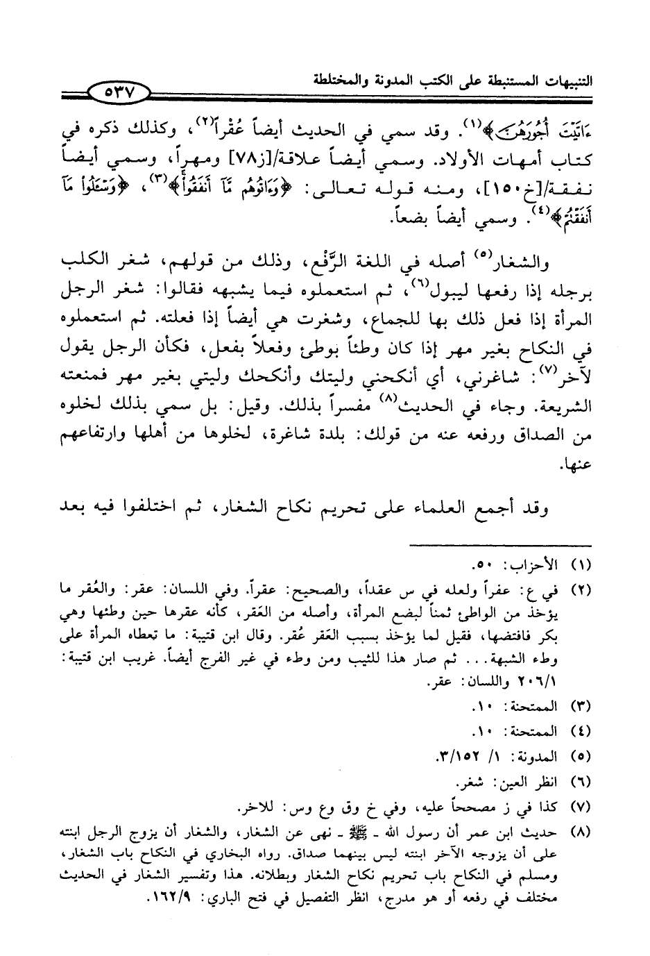 (¬8) حديث ابن عمر أن رسول الله - صلى الله عليه وسلم - نهى عن الشغار، والشغار أن يزوج الرجل ابنته على أن يزوجه الآخر ابنته ليس بينهما صداق. رواه البخاري في النكاح باب الشغار، ومسلم في النكاح باب تحريم نكاح الشغار وبطلانه. هذا وتفسير الشغار في الحديث مختلف في رفعه أو هو مدرج، انظر التفصيل في فتح الباري: 9/ 162.