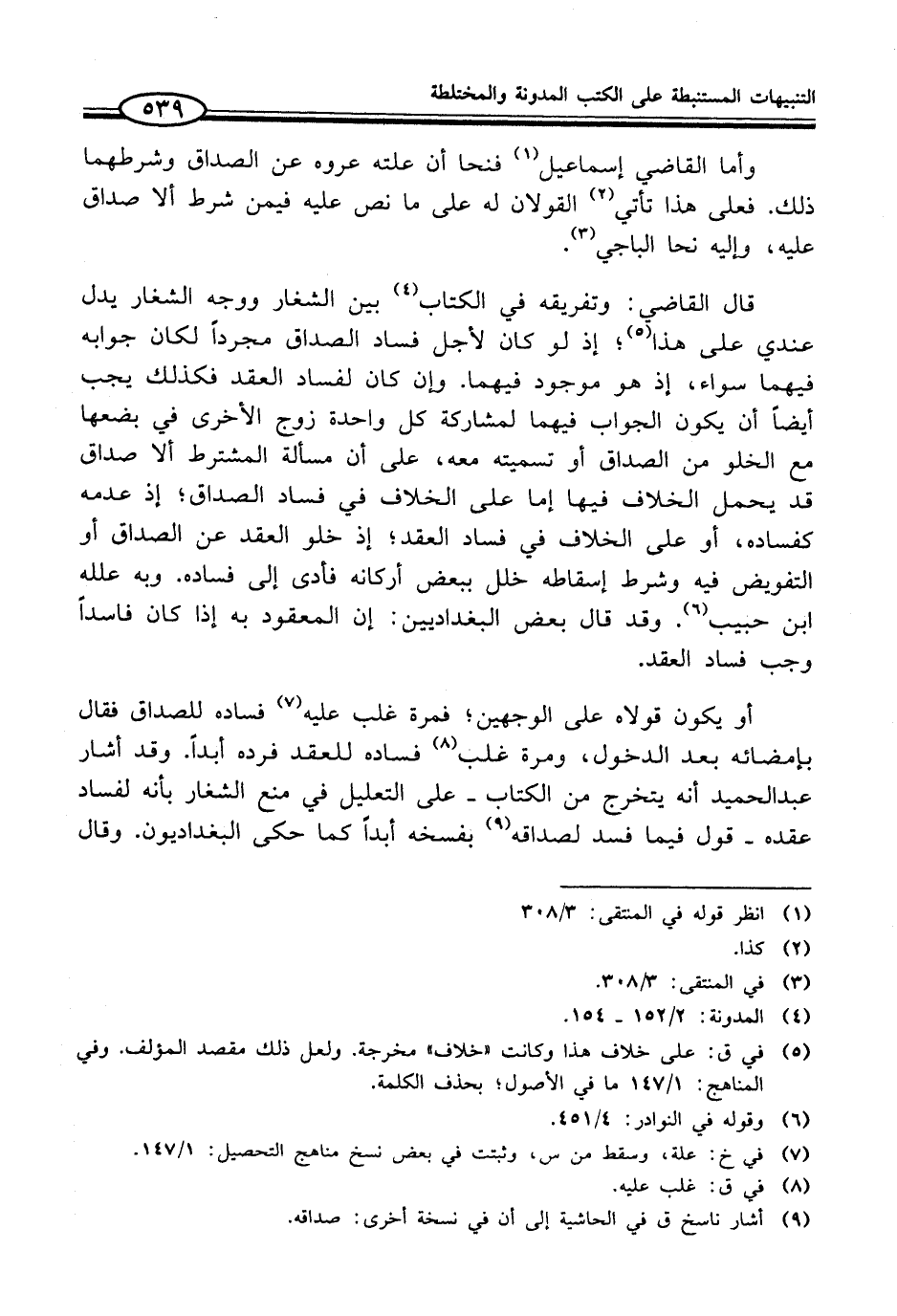 وأما القاضي إسماعيل (¬1) فنحا أن علته عروه عن الصداق وشرطهما ذلك. فعلى هذا تأتي (¬2) القولان له على ما نص عليه فيمن شرط ألا صداق عليه، وإليه نحا الباجي (¬3).