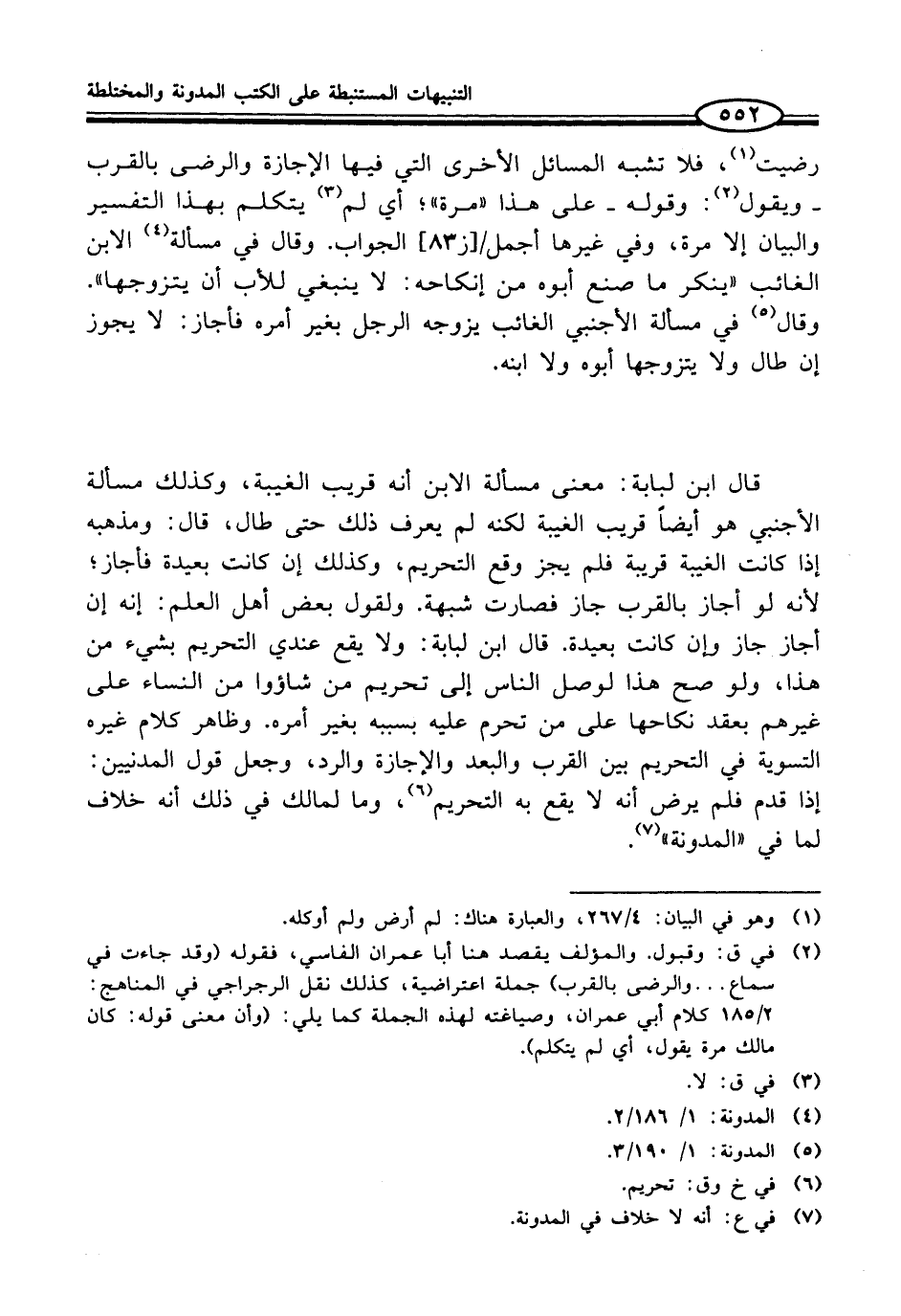 قال ابن لبابة: معنى مسألة الابن أنه قريب الغيبة، وكذلك مسألة الأجنبي هو أيضاً قريب الغيبة لكنه لم يعرف ذلك حتى طال، قال: ومذهبه إذا كانت الغيبة قريبة فلم يجز وقع التحريم، وكذلك إن كانت بعيدة فأجاز؛ لأنه لو أجاز بالقرب جاز فصارت شبهة. ويقول بعض أهل العلم: إنه إن أجاز جاز وإن كانت بعيدة. قال ابن لبابة: ولا يقع عندي التحريم بشيء من هذا، ولو صح هذا لوصل الناس إلى تحريم من شاؤوا من النساء على غيرهم بعقد نكاحها على من تحرم عليه بسببه بغير أمره. وظاهر كلام غيره التسوية في التحريم بين القرب والبعد والإجازة والرد، وجعل قول المدنيين: إذا قدم فلم يرض أنه لا يقع به التحريم (¬6)، وما لمالك في ذلك أنه خلاف لما في "المدونة" (¬7).
