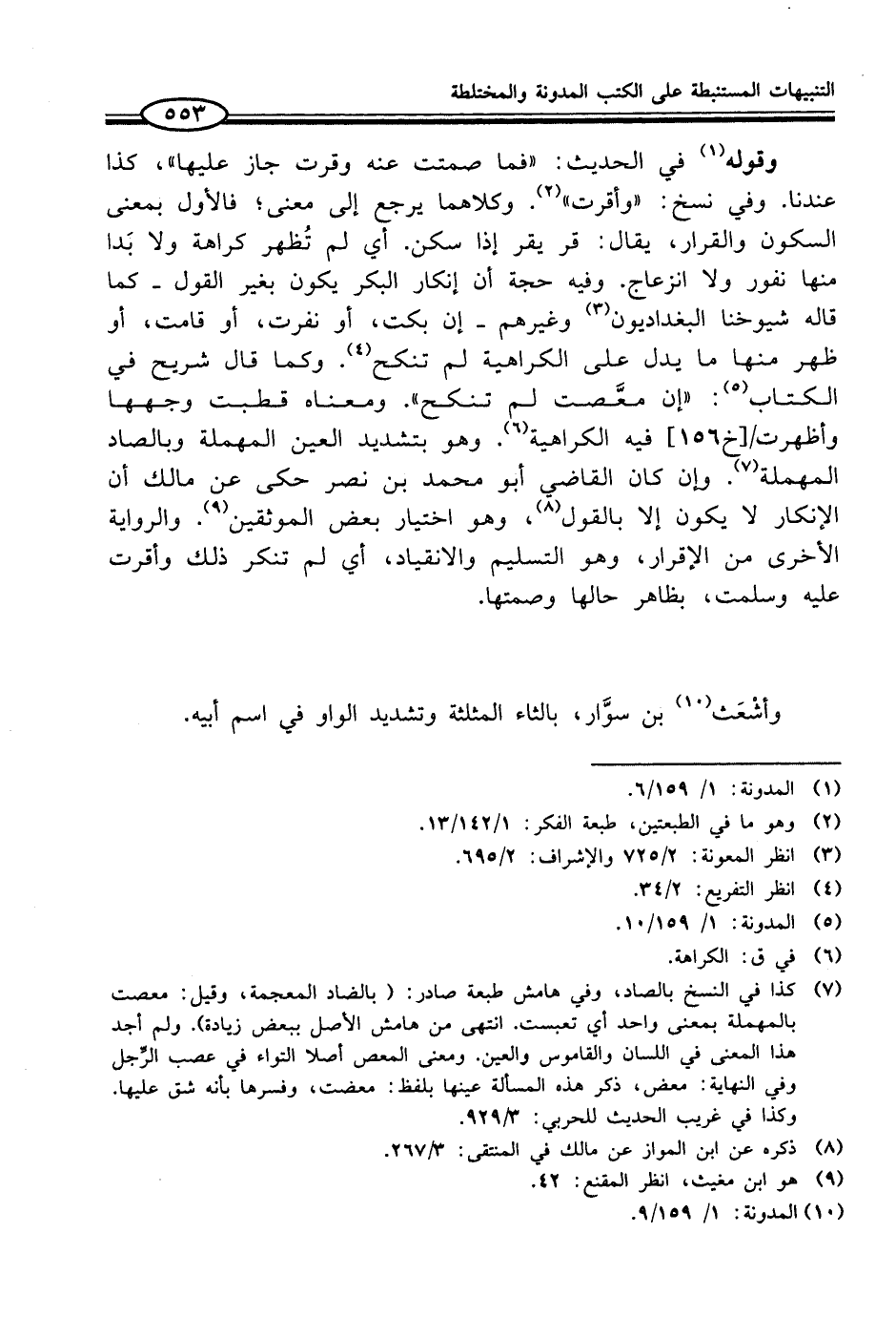 (¬7) كذا في النسخ بالصاد، وفي هامش طبعة صادر: (بالضاد المعجمة، وقيل: معصت بالمهملة بمعنى واحد أي تعبست. انتهى من هامش الأصل ببعض زيادة). ولم أجد هذا المعنى في اللسان والقاموس والعين. ومعنى المعص أصلا التواء في عصب الرَّجل وفي النهاية: معض، ذكر هذه المسألة عينها بلفظ: معضت، وفسرها بأنه شق عليها. وكذا في غريب الحديث للحربي: 3/ 929.