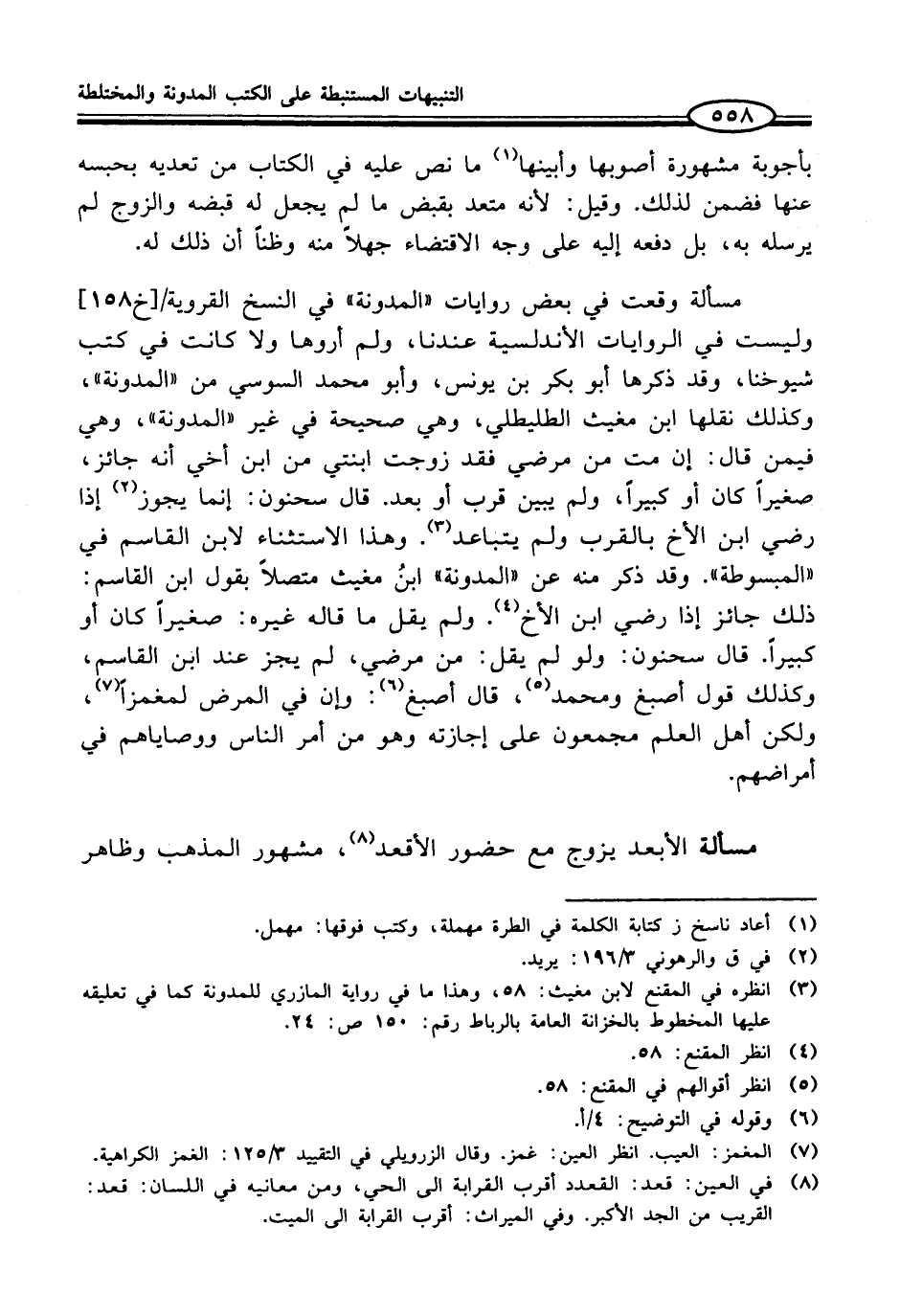 (¬3) انظره في المقنع لابن مغيث: 58، وهذا ما في رواية المازري للمدونة كما في تعليقه عليها المخطوط بالخزانة العامة بالرباط رقم: 150 ص: 24.
