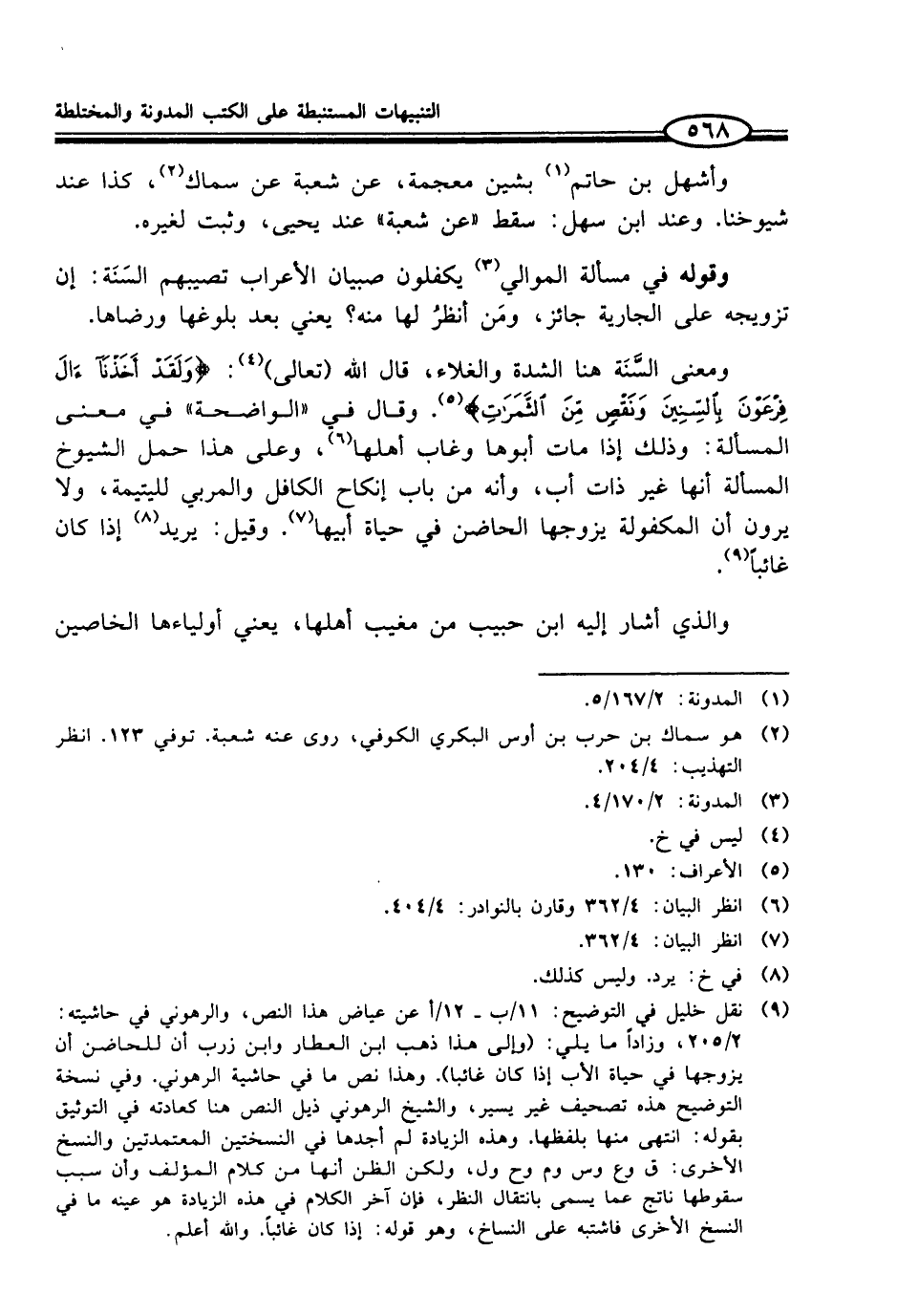 (¬9) نقل خليل في التوضيح: 11/ ب - 12/ أعن عياض هذا النص، والرهوني في حاشيته: 2/ 205، وزاداً ما يلي: (وإلى هذا ذهب ابن العطار وابن زرب أن للحاضن أن يزوجها في حياة الأب إذا كان غائبا). وهذا نص ما في حاشية الرهوني. وفي نسخة التوضيح هذه تصحيف غير يسير، والشيخ الرهوني ذيل النص هنا كعادته في التوثيق بقوله: انتهى منها بلفظها. وهذه الزيادة لم أجدها في النسختين المعتمدتين والنسخ الاخرى: في وع وس وم وح ول، ولكن الظن أنها من كلام المؤلف وأن سبب سقوطها ناتج عما يسمى بانتقال النظر، فإن آخر الكلام في هذه الزيادة هو عينه ما في النسخ الأخرى فاشتبه على النساخ، وهو قوله: إذا كان غائباً. والله أعلم.