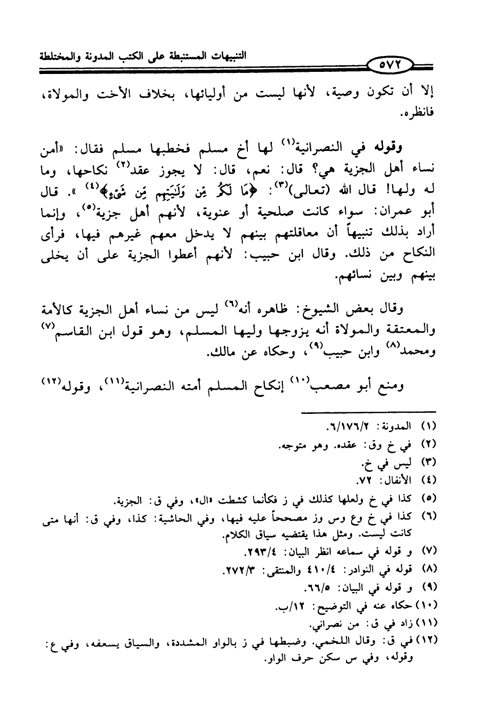 وقوله في النصرانية (¬1) لها أخ مسلم فخطبها مسلم فقال: "أمن نساء أهل الجزية هي؟ قال: نعم، قال: لا يجوز عقد (¬2) نكاحها، وما له ولها! قال الله (تعالى) (¬3): {مَا لَكُمْ مِنْ وَلَايَتِهِمْ مِنْ شَيْءٍ} (¬4) ". قال أبو عمران: سواء كانت صلحية أو عنوية، لأنهم أهل جزية (¬5)، وإنما أراد بذلك تنبيهاً أن معاقلتهم بينهم لا يدخل معهم غيرهم فيها، فرأى النكاح من ذلك. وقال ابن حبيب: لأنهم أعطوا الجزية على أن يخلى بينهم وبين نسائهم.
