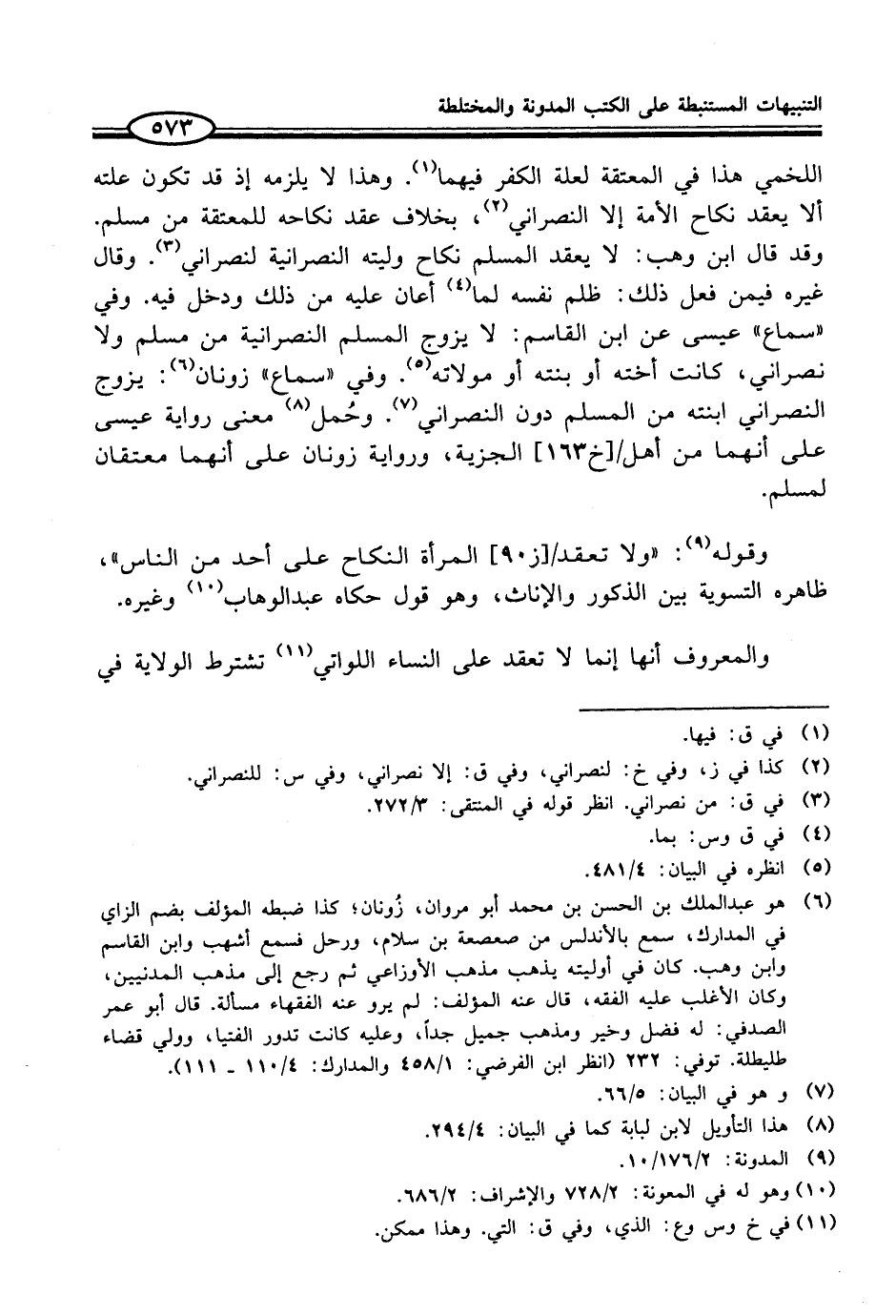 (¬6) هو عبد الملك بن الحسن بن محمد أبو مروان، زُونان؛ كذا ضبطه المؤلف بضم الزاي في المدارك، سمع بالأندلس من صعصعة بن سلام، ورحل فسمع أشهب وابن القاسم وابن وهب. كان في أوليته يذهب مذهب الأوزاعي ثم رجع إلى مذهب المدنيين، وكان الأغلب عليه الفقه، قال عنه المؤلف: لم يرو عنه الفقهاء مسألة. قال أبو عمر الصدفي: له فضل وخير ومذهب جميل جداً، وعليه كانت تدور الفتيا، وولي قضاء طليطلة. توفي: 232 (انظر ابن الفرضي: 1/ 458 والمدارك: 4/ 110 - 111).