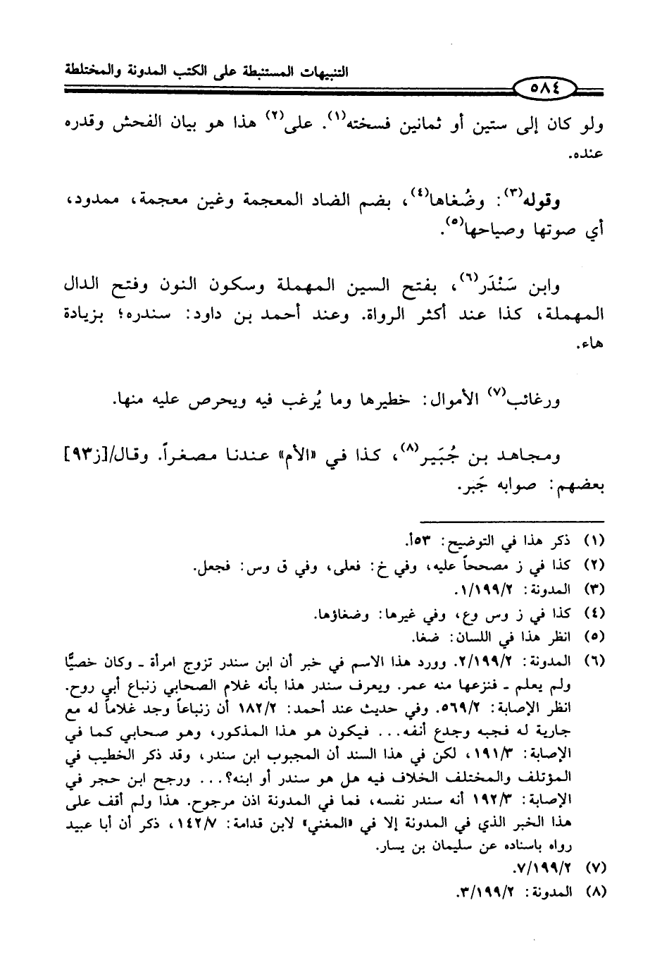 (¬6) المدونة: 2/ 199/ 2. وورد هذا الاسم في خبر أن ابن سندر تزوج امرأة - وكان خصيًّا ولم يعلم - فنزعها منه عمر. ويعرف سندر هذا بأنه غلام الصحابي زنباع أبي روح. انظر الإصابة: 2/ 569. وفي حديث عند أحمد: 2/ 182 أن زنباعاً وجد غلاماً له مع جارية له فجبه وجدع أنفه ... فيكون هو هذا المذكور، وهو صحابي كما في الإصابة: 3/ 191، لكن في هذا السند أن المجبوب ابن سندر، وقد ذكر الخطيب في المؤتلف والمختلف الخلاف فيه هل هو سندر أو ابنه؟ ... ورجح ابن حجر في الإصابة: 3/ 192 أنه سندر نفسه، فما في المدونة اذن مرجوح. هذا ولم أقف على هذا الخبر الذي في المدونة إلا في "المغني" لابن قدامة: 7/ 142، ذكر أن أبا عبيد رواه باسناده عن سليمان بن يسار.