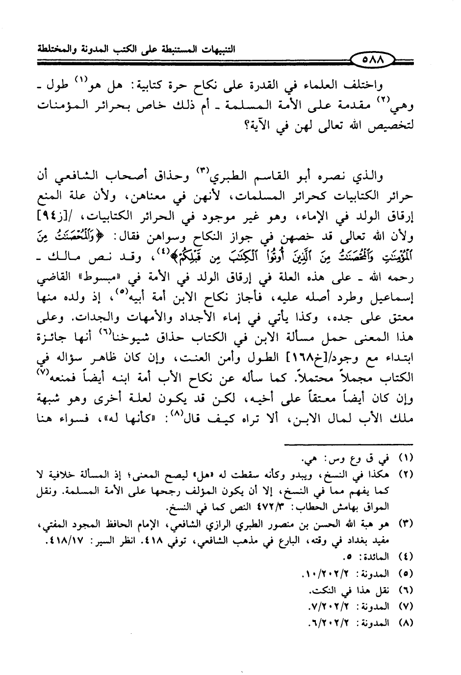 (¬2) هكذا في النسخ، ويبدو وكأنه سقطت له "هل" ليصح المعنى؛ إذ المسألة خلافية لا كما يفهم مما في النسخ، إلا أن يكون المؤلف رجحها على الأمة المسلمة. ونقل المواق بهامش الحطاب: 3/ 472 النص كما في النسخ.