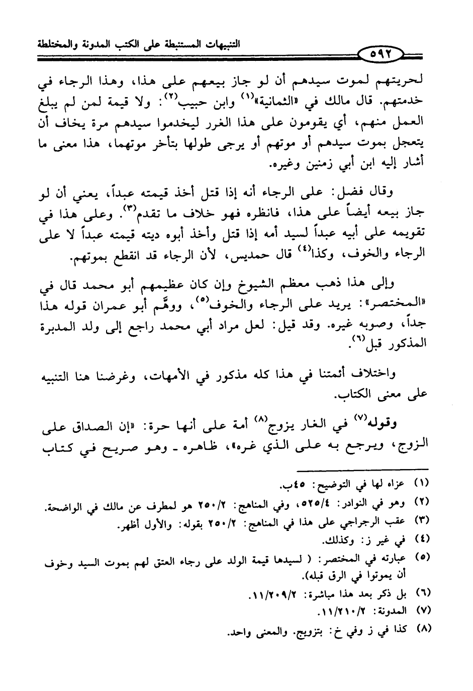 وإلى هذا ذهب معظم الشيوخ وإن كان عظيمهم أبو محمد قال في "المختصر": يريد على الرجاء والخوف (¬5)، ووهَّم أبو عمران قوله هذا جداً، وصوبه غيره. وقد قيل: لعل مراد أبي محمد راجع إلى ولد المدبرة المذكور قبل (¬6).