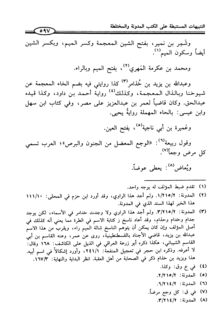 (¬3) المدونة: 2/ 215/ 3. ولم أجد هذا الراوي ولا وجدت خدامر في الأسماء، لكن يوجد جدام وخدام وحذام، وقد أعاد ناسخ ز كتابة الاسم في الطرة مما يعني أنه كذلك في أصل المؤلف وإن كان يمكن أن بتوهم الناسخ شالة الميم راء، ويقرب من هذا الاسم عبد الله بن يزيد، قاضي الأجناد بالقسطنطينية، روى عن عمر، وعنه القاسم بن أبي القاسم الشيباني، هكذا ذكره أبو زرعة العراقي في الذيل على الكاشف: 168 وقال: لا أعرفه. وذكره ابن حجر في تعجيل المنفعة: 1/ 241، وأورد إشكالاً في اسم أبيه. هذا ويزيد بن خذام ذكر في الصحابة من أهل العقبة. انظر البداية والنهاية: 3/ 167.