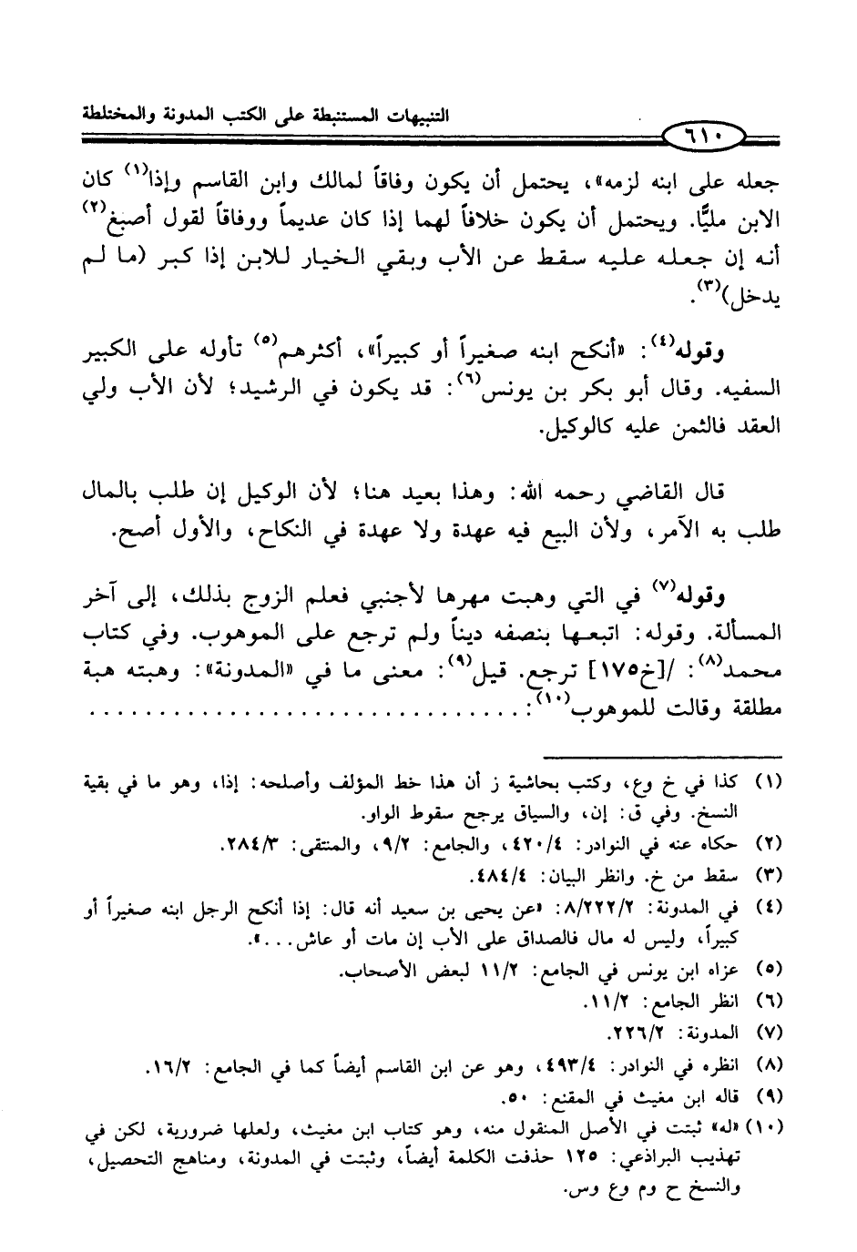 (¬10) "له" ثبتت في الأصل المنقول منه، وهو كتاب ابن مغيث، ولعلها ضرورية، لكن في تهذيب البراذعي: 125 حذفت الكلمة أيضاً، وثبتت في المدونة، ومناهج التحصيل، والنسخ ح وم وع وس.