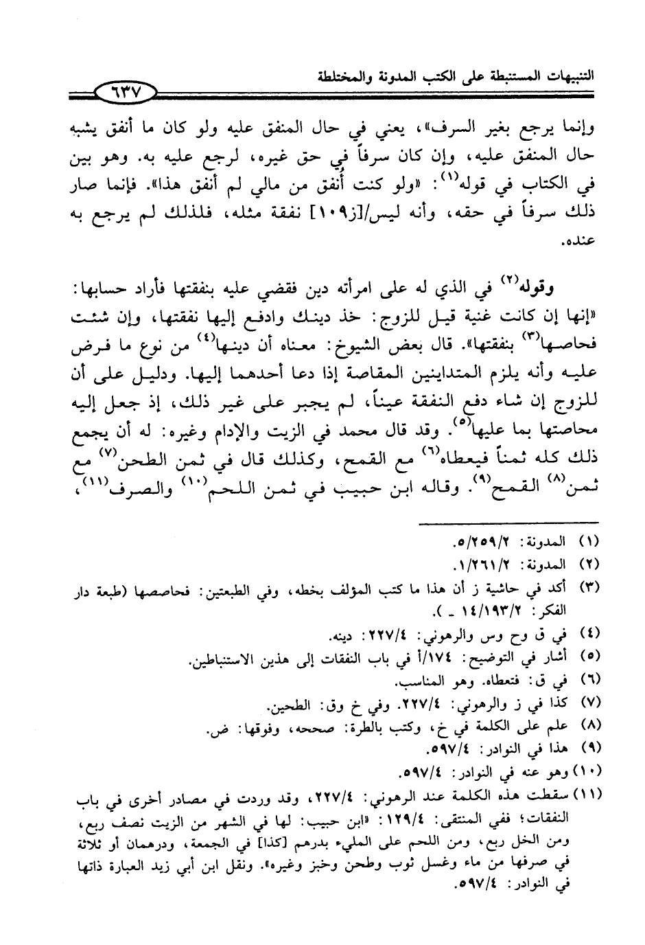 (¬11) سقطت هذه الكلمة عند الرهوني: 4/ 227، وقد وردت في مصادر أخرى في باب النفقات؛ ففي المنتقى: 4/ 129: "ابن حبيب: لها فى الشهر من الزيت نصف ربع، ومن الخل ربع، ومن اللحم على المليء بدرهم [كذا] في الجمعة، ودرهمان أو ثلاثة في صرفها من ماء وغسل ثوب وطحن وخبز وغيره". ونقل ابن أبي زيد العبارة ذاتها في النوادر: 4/ 597.
