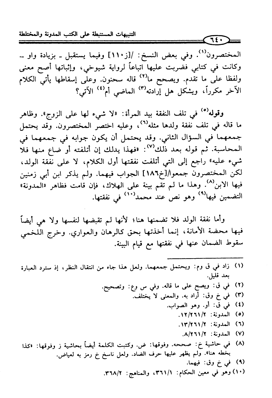وقوله (¬5) في تلف النفقة بيد المرأة: "لا شيء لها على الزوج". وظاهر ما قاله في تلف نفقة ولدها مثله (¬6)، وعليه اختصر المختصرون. وقد يحتمل جمعهما في السؤال الثاني. وقد يحتمل أن يكون جوابه في جمعهما في المحاسبة. ثم قوله بعد ذلك (¬7): "فهذا يدلك إن أتلفته أو ضاع منها فلا شيء عليه" راجع إلى التي أتلفت نفقتها أول الكلام، لا على نفقة الولد، لكن المختصرون جمعوا/ [خ 186] الجواب فيهما. ولم يذكر ابن أبي زمنين فيها الابن (¬8). وهذا ما لم تقم بينة على الهلاك، فإن قامت فظاهر "المدونة" التضمين فيها (¬9) وهو نص عند محمد (¬10) في نفقتها.
