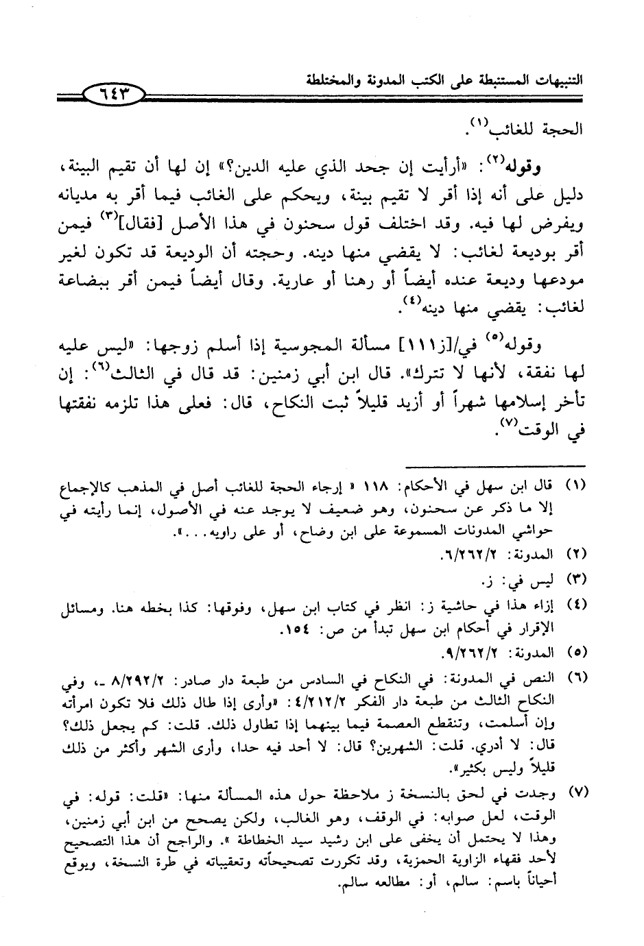 (¬1) قال ابن سهل في الأحكام: 118 "إرجاء الحجة للغائب أصل في المذهب كالإجماع إلا ما ذكر عن سحنون، وهو ضعيف لا يوجد عنه في الأصول، إنما رأيته في حواشي المدونات المسموعة على ابن وضاح، أو على راويه ... ".