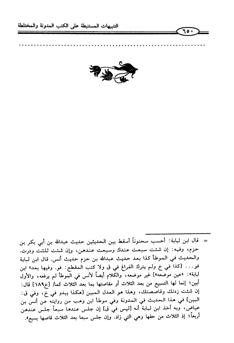 = قال ابن لبابة: أحسب سحنوناً أسقط بين الحديثين حديث عبد الله بن أبي بكر بن حزم، وفيه: إن شئت سبعت عندك وسبعت عندهن، وإن شئت ثلثت ودرت. والحديث في الموطأ كذا بعد حديث عبد الله بن حزم حديث أنس. قال ابن لبابة فو ... [كذا في خ ولم يترك الفراغ في ق ولا كتب المقطع: فو. وفيها بعد" ابن لبابة": "عين موضعه"] غير موضعه، والكلام أيضاً لأنس في الموطأ لم يرفعه، والأول أبين؛ إنما لها التسبيع من بعد الثلاث أو مقاصتها بما بعد الثلاث كما/ [خ 189] قال: إن شئت زدتك وقاصصتك، وهذا هو العدل المبين [هكذا يبدو في خ، وفي ق: البين] فى هذا الحديث في المدونة وفي موطأ ابن وهب من روايته عن أنس بن عياض، وبه أخذ ابن لبابة أنه [ليس في ق] إن جلس عندها سبعاً جلس عندهن أربعاً؛ إذ الثلاث من حقها وهي التي زاد. وإن جلس سبعا بعد الثلاث قاصها بسبع".