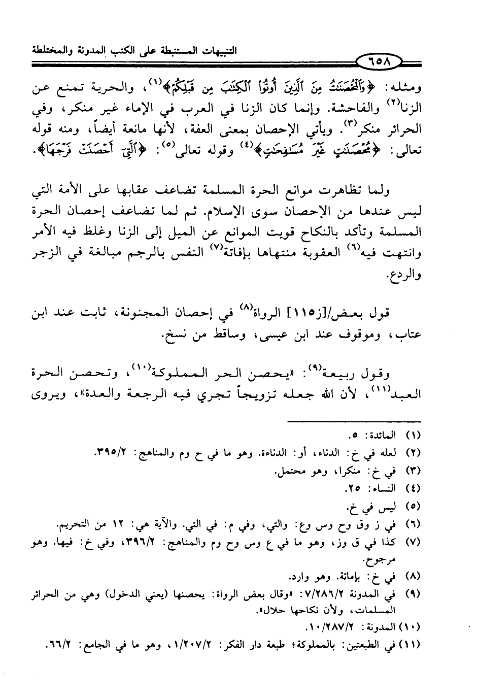 (¬9) في المدونة 2/ 286/ 7: "وقال بعض الرواة: يحصنها (يعني الدخول) وهي من الحرائر المسلمات، ولأن نكاحها حلال".