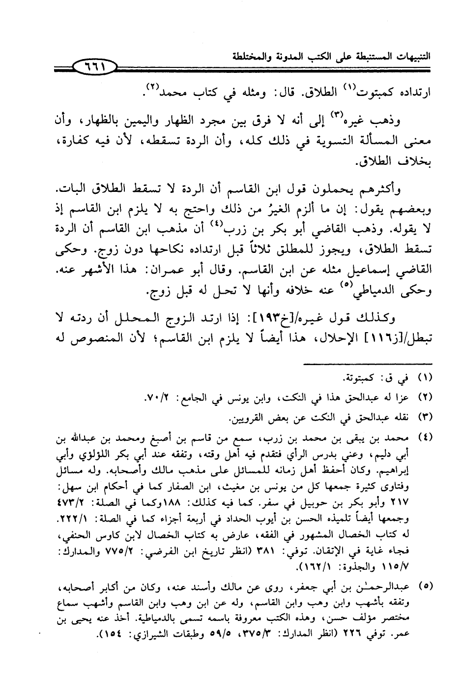 وأكثرهم يحملون قول ابن القاسم أن الردة لا تسقط الطلاق البات. وبعضهم يقول: إن ما ألزم الغيرُ من ذلك واحتج به لا يلزم ابن القاسم إذ لا يقوله. وذهب القاضي أبو بكر بن زرب (¬4) أن مذهب ابن القاسم أن الردة تسقط الطلاق، ويجوز للمطلق ثلاثاً قبل ارتداده نكاحها دون زوج. وحكى القاضي إسماعيل مثله عن ابن القاسم. وقال أبو عمران: هذا الأشهر عنه. وحكى الدمياطي (¬5) عنه خلافه وأنها لا تحل له قبل زوج.
