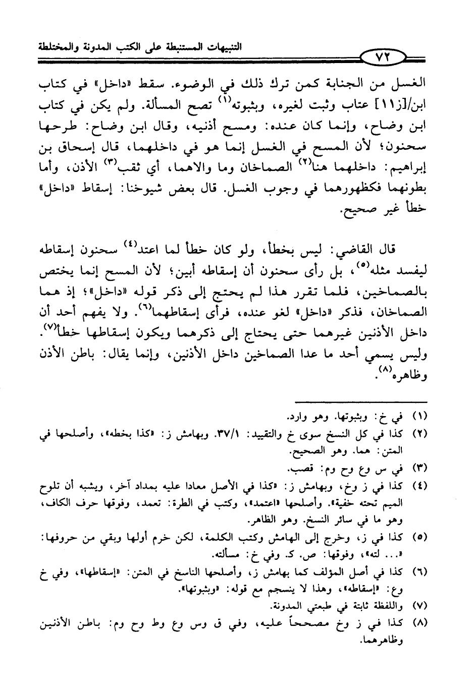 قال القاضي: ليس بخطأ, ولو كان خطأ لما اعتد (¬4) سحنون إسقاطه ليفسد مثله (¬5)، بل رأى سحنون أن إسقاطه أبين؛ لأن المسح إنما يختص بالصماخين، فلما تقرر هذا لم يحتج إلى ذكر قوله "داخل"؛ إذ هما الصماخان، فذكر "داخل" لغو عنده، فرأى إسقاطهما (¬6). ولا يفهم أحد أن داخل الأذنين غيرهما حتى يحتاج إلى ذكرهما ويكون إسقاطها خطأ (¬7). وليس يسمي أحد ما عدا الصماخين داخل الأذنين، وإنما يقال: باطن الأذن وظاهره (¬8).