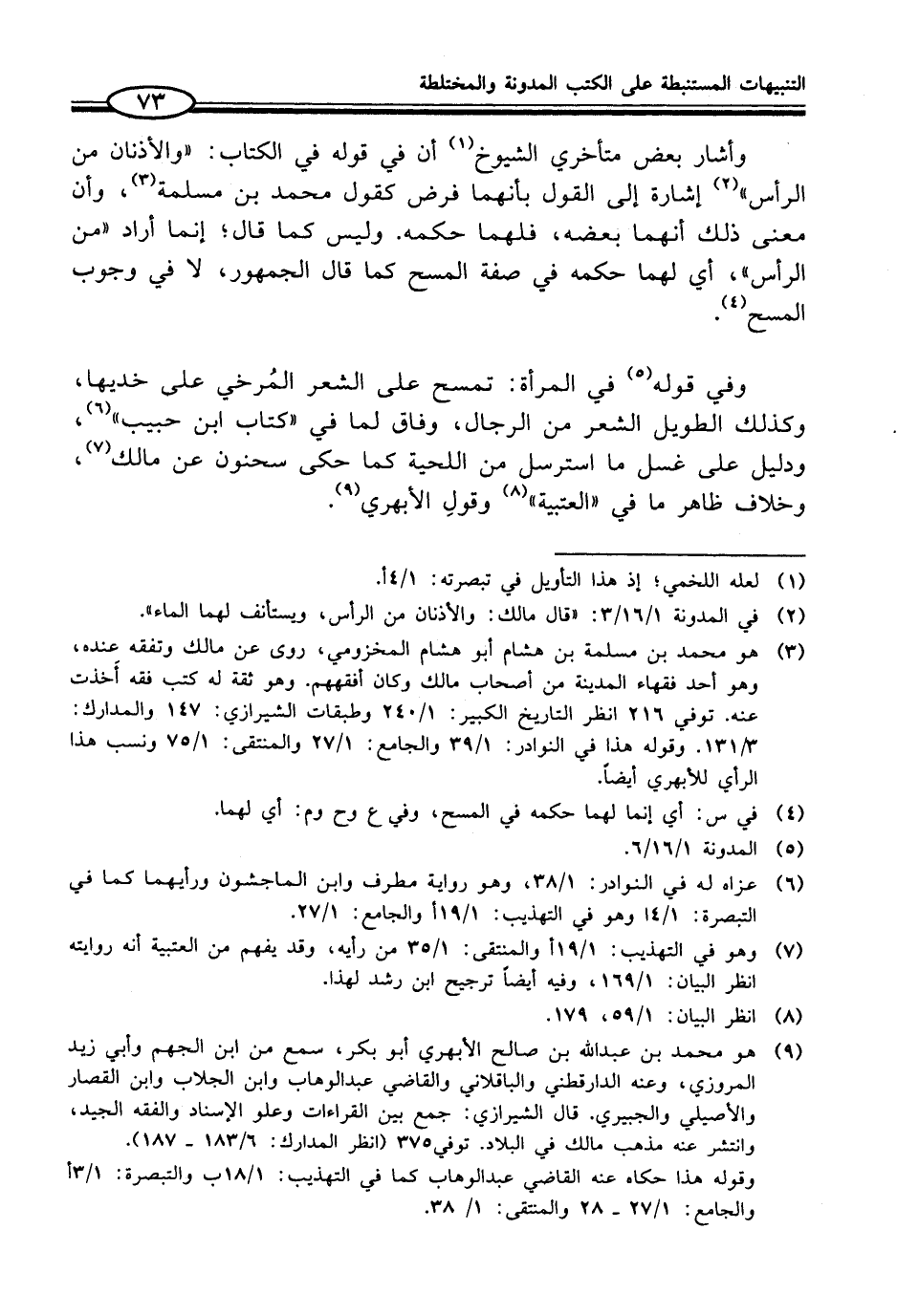 (¬3) هو محمَّد بن مسلمة بن هشام أبو هشام المخزومي، روى عن مالك وتفقه عنده، وهو أحد فقهاء المدينة من أصحاب مالك وكان أفقههم. وهو ثقة له كتب فقه أَخذت عنه. توفي 216 انظر التاريخ الكبير: 1/ 240 وطبقات الشيرازي: 147 والمدارك: 3/ 131. وقوله هذا في النوادر: 1/ 39 والجامع: 1/ 27 والمنتقى: 1/ 75 ونسب هذا الرأي للأبهري أيضاً.