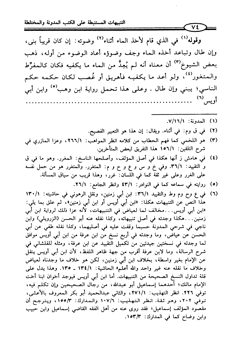 (¬6) في ع وح وم وط والتقييد 1/ 36: ابن أبي زمنين، ونقل الرهوني في حاشيته: 1/ 130 هذا النص عن التنبيهات هكذا: "ابن أبي أويس أو ابن أبي زمنين"، ثم علق بما يلي: "ابن أبي أويس ... مخالف لما لعياض في التنبيهات, لأنه عزا ذلك لرواية ابن أبي زمنين ... هكذا وجدته في أصل تنبيهاته، وكذا نقله عنه أبو الحسن (الزرويلي) وابن ناجي في شرحي المدونة حسبما وقفت عليه في أصليهما، وكذا نقله طفي عن أبي الحسن عن عياض، وما وجدته في أربع نسخ من ابن عرفة من ابن أبي أويس موافق لما وجدته في نسختين جيدتين من تكميل التقييد عن ابن عرفة، ومثله للقلشاني في شرح الرسالة، وما لابن عرفة أقرب من جهة ظاهر اللفظ, لأن ابن أبي أويس ينقل عن الإِمام بغير واسطة، بخلاف ابن أبي زمنين، لكن هو خلاف ما وجدناه لعياض وخلاف ما نقله عنه غير واحد والله اعلم" الحاشية: 1/ 134 - 135. وهذا يدل على قلة تداول النسخ الصحيحة من التنبيهات. أما ابن أبي أويس فيوجد أخوان ابنا أخت الإِمام مالك؛ أحدهما إسماعيل أبو عبد الله، من رجال الصحيحين وإن تكلم فيه، توفي 226. انظر التهذيب: 1/ 271، والثاني عبد الحميد أبو بكر المعروف بالأعشى، توفي 202، وهو ثقة. انظر التهذيب: 6/ 107 والمدارك: 3/ 155، ويترجح أن مقصود المؤلف إسماعيل؛ فقد روى عنه من أهل الفقه القاضي إسماعيل وابن حبيب وابن وضاح كما في المدارك: 3/ 153.