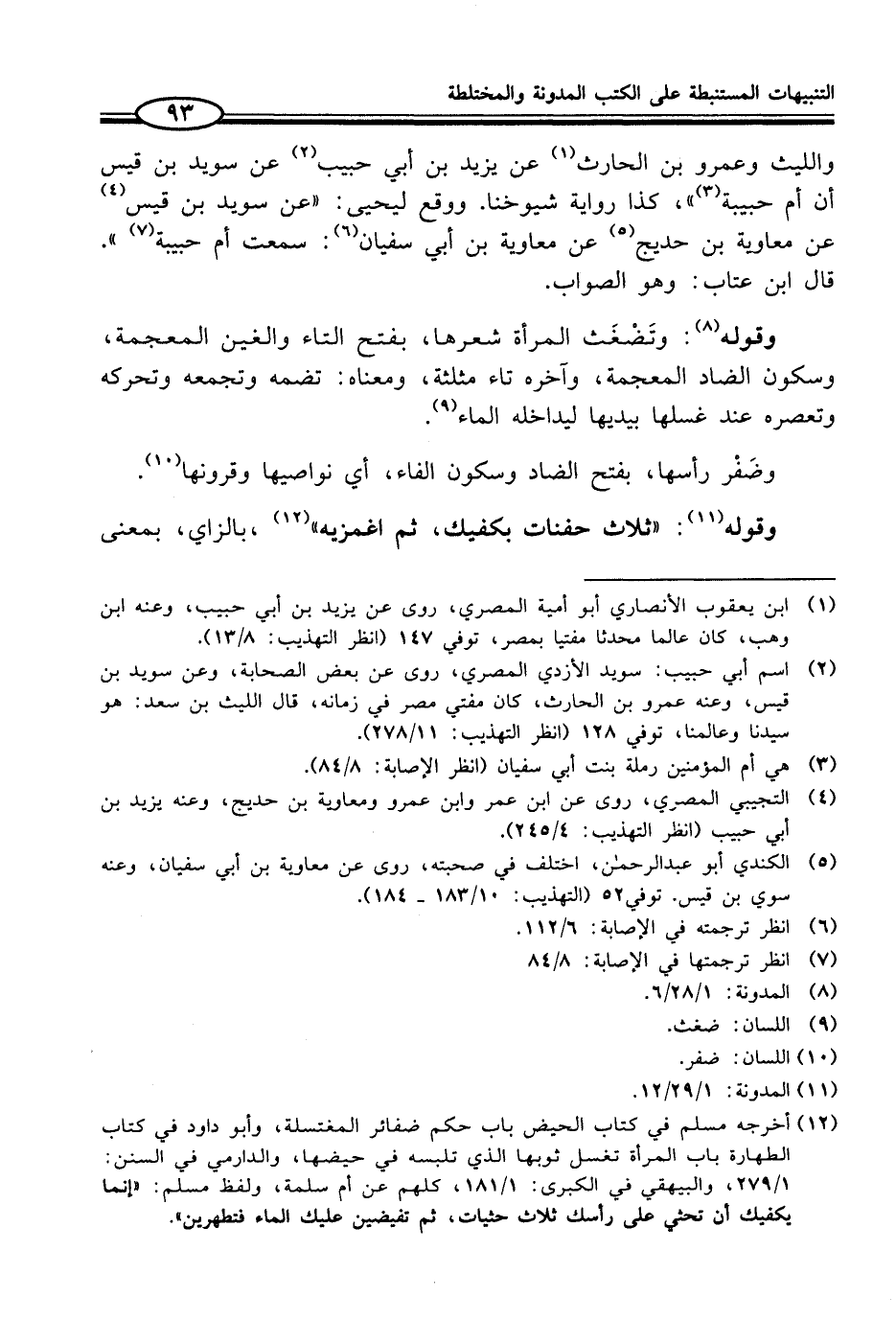 والليث وعمرو بن الحارث (¬1) عن يزيد بن أبي حبيب (¬2) عن سويد بن قيس أن أم حبيبة (¬3) "، كذا رواية شيوخنا. ووقع ليحيى: "عن سويد بن قيس (¬4) عن معاوية بن حديج (¬5) عن معاوية بن أبي سفيان (¬6): سمعت أم حبيبة (¬7) ". قال ابن عتاب: وهو الصواب.