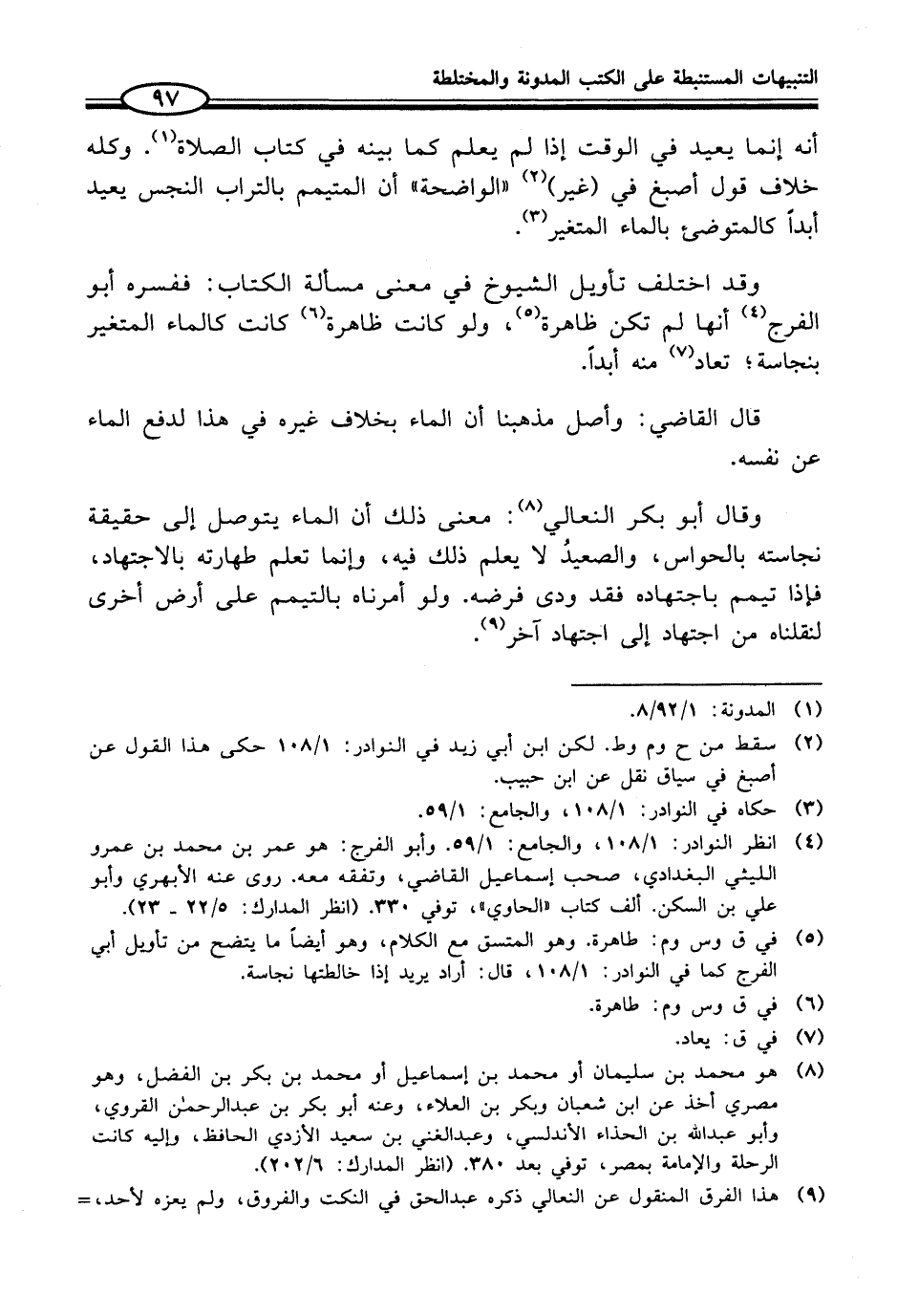 (¬4) انظر النوادر: 1/ 108، والجامع: 1/ 59. وأبو الفرج: هو عمر بن محمَّد بن عمرو الليثي البغدادي، صحب إسماعيل القاضي، وتفقه معه. روى عنه الأبهري وأبو علي بن السكن. ألف كتاب "الحاوي"، توفي 330. (انظر المدارك: 5/ 22 - 23).