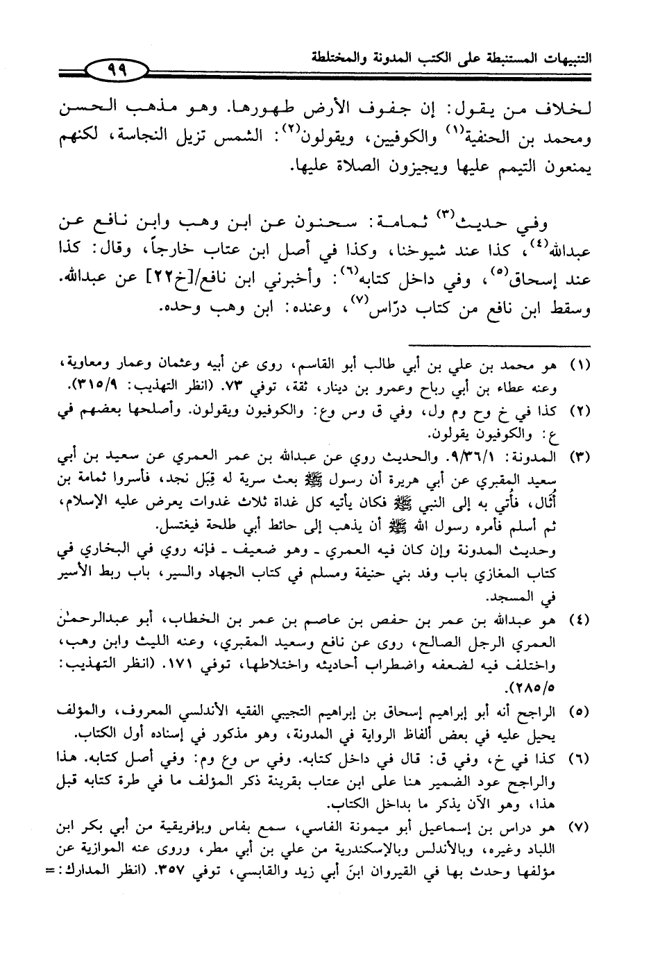وفي حديث (¬3) ثمامة: سحنون عن ابن وهب وابن نافع عن عبد الله (¬4)، كذا عند شيوخنا، وكذا في أصل ابن عتاب خارجاً، وقال: كذا عند إسحاق (¬5)، وفي داخل كتابه (¬6): وأخبرني ابن نافع/ [خ 22] عن عبد الله. وسقط ابن نافع من كتاب درّاس (¬7)، وعنده: ابن وهب وحده.