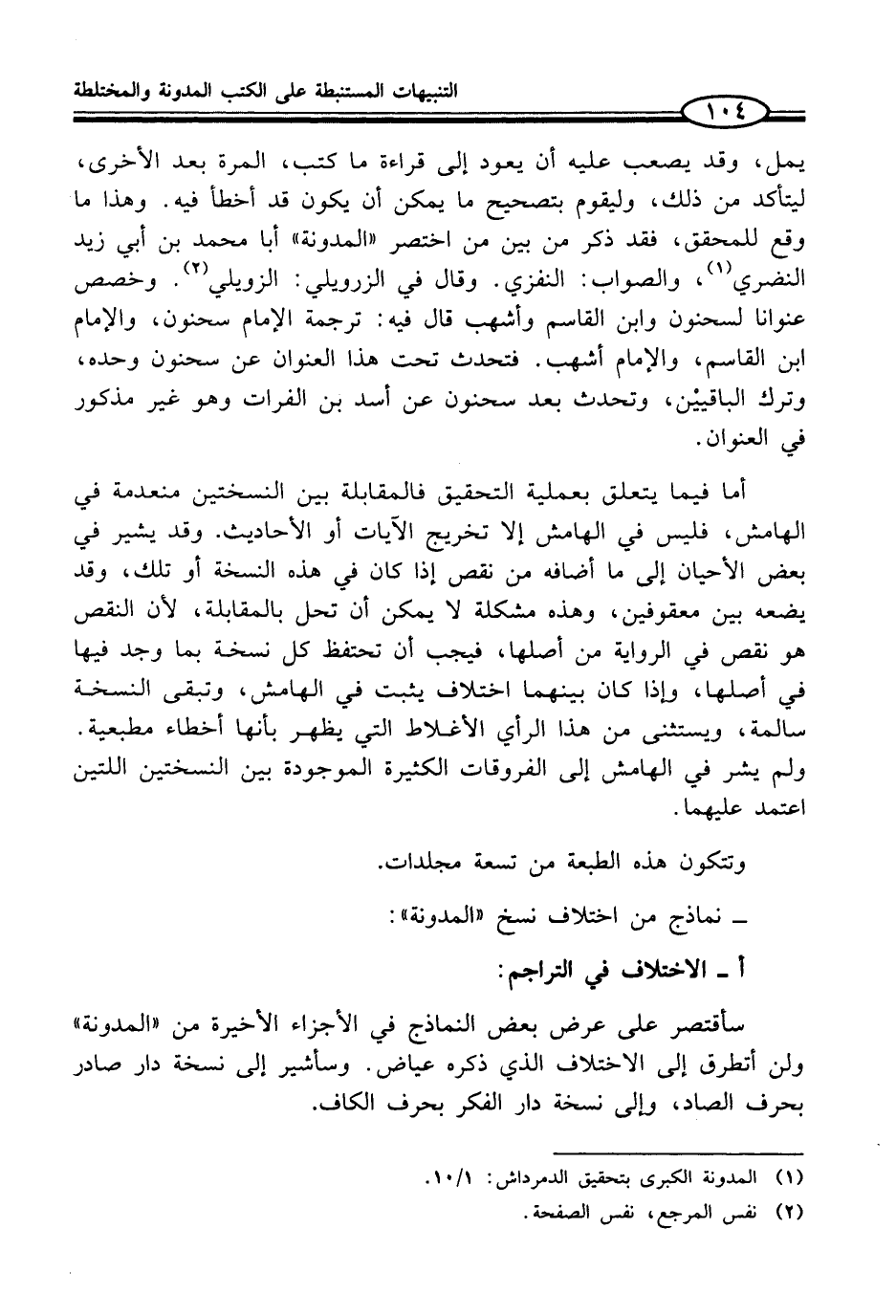 يمل، وقد يصعب عليه أن يعود إلى قراءة ما كتب، المرّة بعد الأخرى، ليتأكد من ذلك، وليقوم بتصحيح ما يمكن أن يكون قد أخطأ فيه. وهذا ما وقع للمحقق، فقد ذكر من بين من اختصر "المدونة" أبا محمَّد بن أبي زيد النضري (¬1)، والصواب: النفزي. وقال في الزرويلي: الزويلي (¬2). وخصص عنوانا لسحنون وابن القاسم وأشهب قال فيه: ترجمة الإمام سحنون، والإمام ابن القاسم، والإمام أشهب. فتحدث تحت هذا العنوان عن سحنون وحده، وترك الباقيين، وتحدث بعد سحنون عن أسد بن الفرات وهو غير مذكور في العنوان.