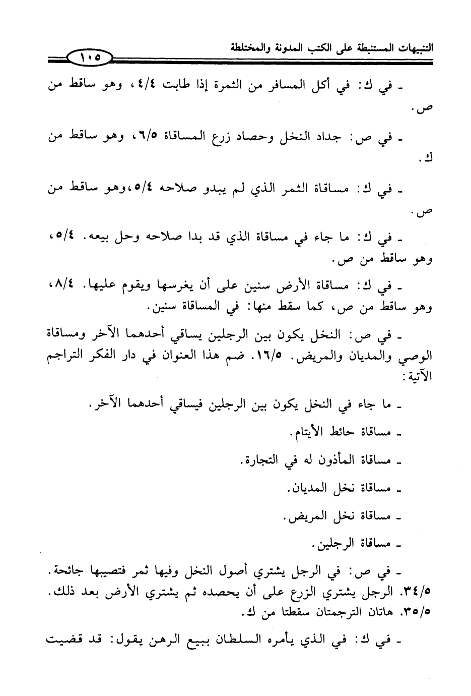 - في ص: النخل يكون بين الرجلين يساقي أحدهما الآخر ومساقاة الوصي والمديان والمريض. 5/ 16. ضم هذا العنوان في دار الفكر التراجم الآتية: