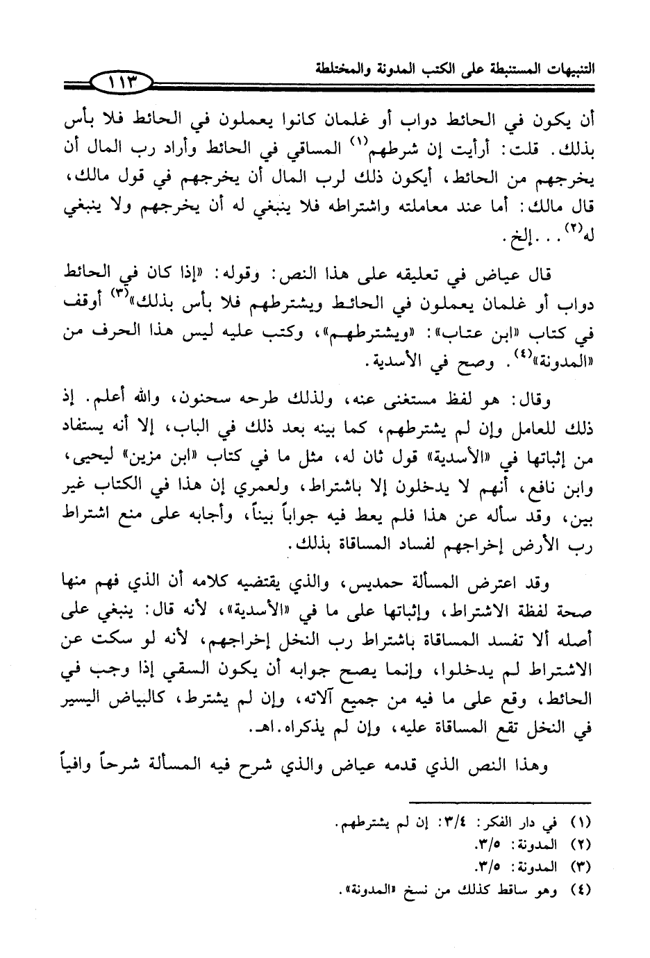 قال عياض في تعليقه على هذا النص: وقوله: "إذا كان في الحائط دواب أو غلمان يعملون في الحائط ويشترطهم فلا بأس بذلك" (¬3) أوقف في كتاب "ابن عتاب": "ويشترطهم"، وكتب عليه ليس هذا الحرف من "المدونة" (¬4). وصح في الأسدية.