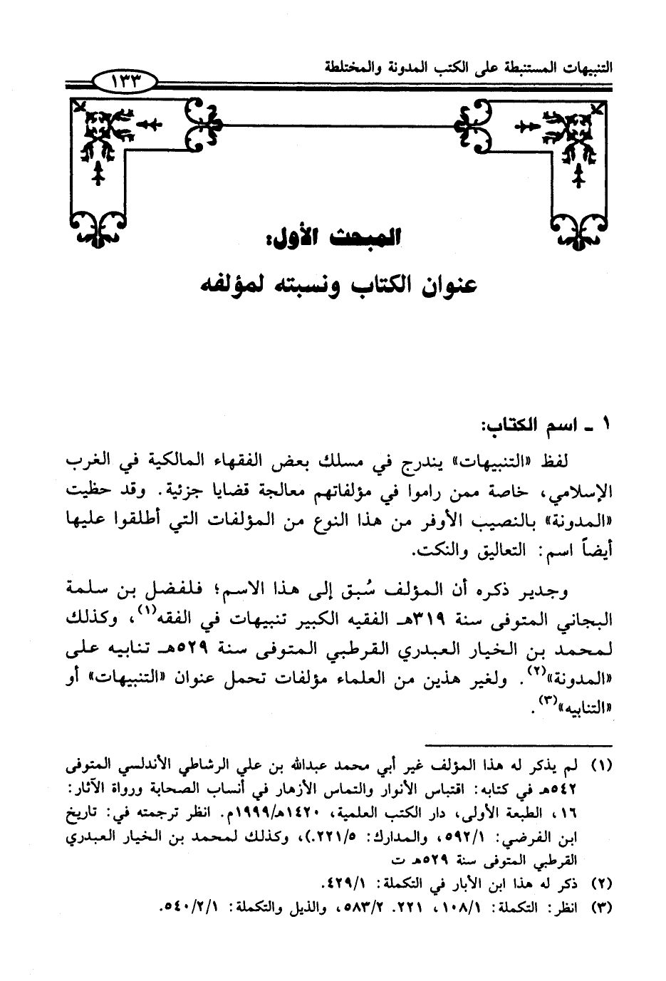 وجدير ذكره أن المؤلف سُبق إلى هذا الاسم؛ فلفضل بن سلمة البجاني المتوفى سنة 319 هـ الفقيه الكبير تنبيهات في الفقه (¬1)، وكذلك لمحمد بن الخيار العبدري القرطبي المتوفى سنة 529 هـ تنابيه على "المدونة" (¬2). ولغير هذين من العلماء مؤلفات تحمل عنوان "التنبيهات" أو "التنابيه" (¬3).