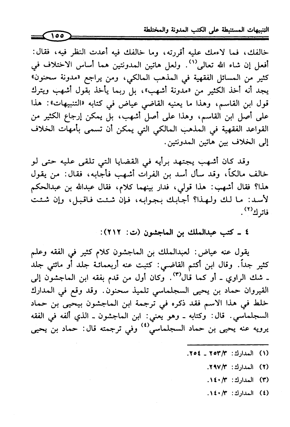 يقول عنه عياض: لعبد الملك بن الماجشون كلام كثير في الفقه وعلم كثير جداً. وقال ابن أكتم القاضي: كتبت عنه أربعمائة جلد أو مائتي جلد - شك الراوي - أو كما قال (¬3). وكان أول من قدم بفقه ابن الماجشون إلى القيروان حماد بن يحيى السجلماسي تلميذ سحنون. وقد وقع في المدارك خلط في هذا الاسم فقد ذكره في ترجمة ابن الماجشون بيحيى بن حماد السجلماسي. قال: وكتابه - وهو يعني: ابن الماجشون - الذي ألفه في الفقه يرويه عنه يحيى بن حماد السجلماسي (¬4) وفي ترجمته قال: حماد بن يحيى