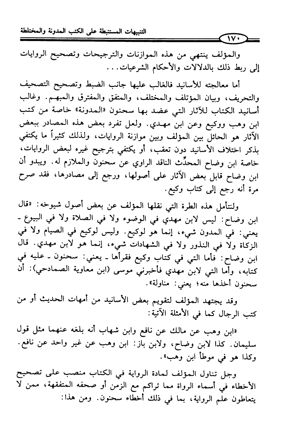 ولنتأمل هذه الطرة التي نقلها المؤلف عن بعض أصول شيوخه: "قال ابن وضاح: ليس لابن مهدي في الوضوء ولا في الصلاة ولا في البيوع - يعني: في المدون شيء، إنما هو لوكيع. وليس لوكيع في الصيام ولا في الزكاة ولا في النذور ولا في الشهادات شيء، إنما هو لابن مهدي. قال ابن وضاح: فأما التي في كتاب وكيع فقرأها - يعني: سحنون - عليه في كتابه، وأما التي لابن مهدي فأخبرني موسى (ابن معاوية الصمادحي): أن سحنون أخذها منه؛ يعني: مناولة".