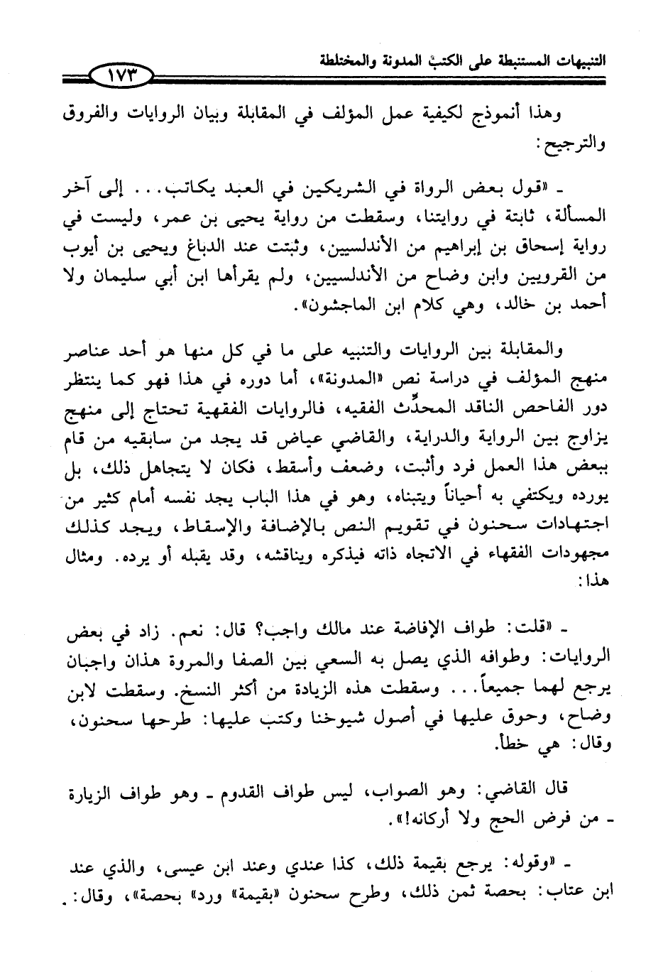 - "قلت: طواف الإفاضة عند مالك واجب؟ قال: نعم. زاد في بعض الروايات: وطوافه الذي يصل به السعي بين الصفا والمروة هذان واجبان يرجع لهما جميعاً ... وسقطت هذه الزيادة من أكثر النسخ. وسقطت لابن وضاح، وحوق عليها في أصول شيوخنا وكتب عليها: طرحها سحنون، وقال: هي خطأ.