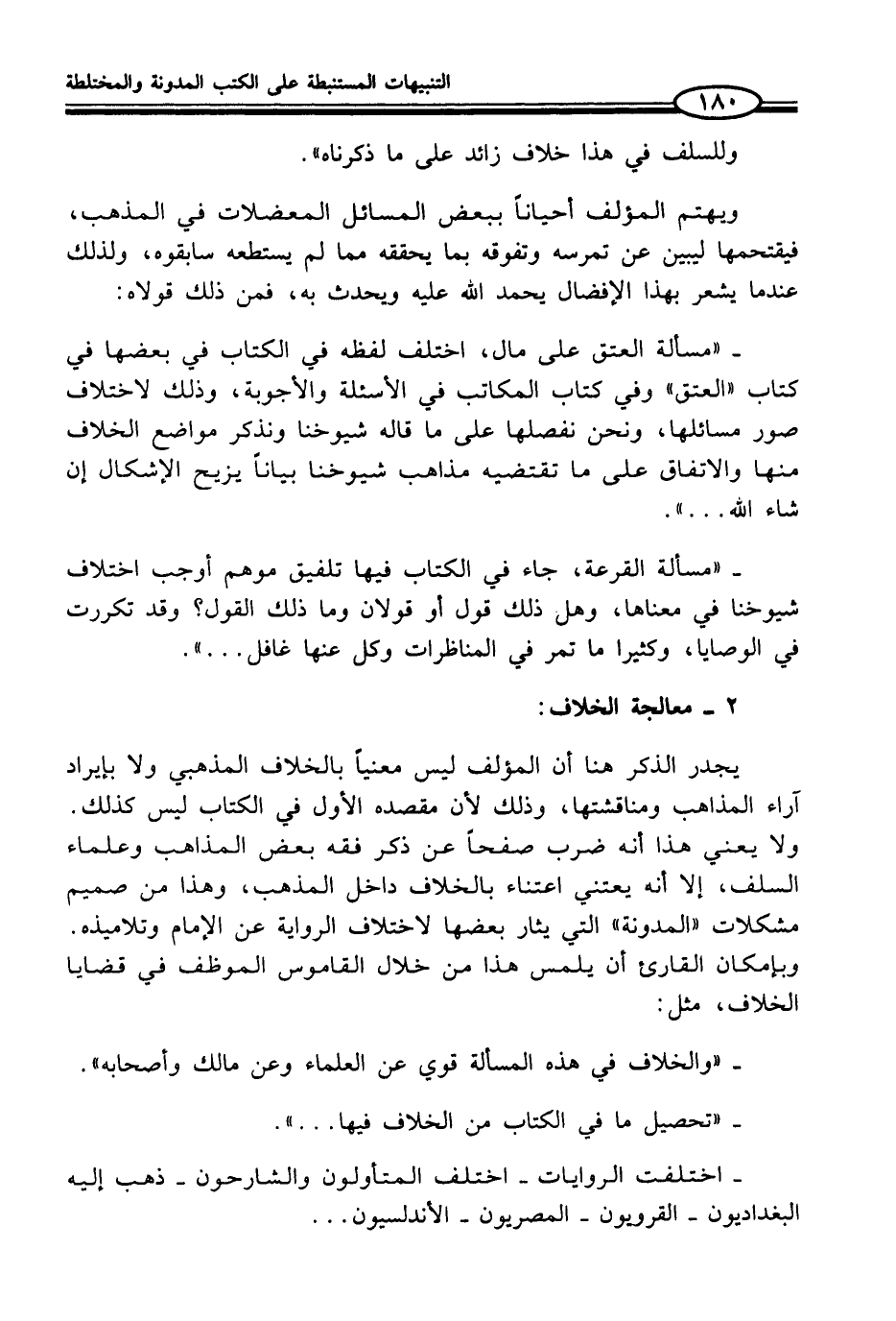 يجدر الذكر هنا أن المؤلف ليس معنياً بالخلاف المذهبي ولا بإيراد آراء المذاهب ومناقشتها، وذلك لأن مقصده الأول في الكتاب ليس كذلك. ولا يعني هذا أنه ضرب صفحاً عن ذكر فقه بعض المذاهب وعلماء السلف، إلا أنه يعتني اعتناء بالخلاف داخل المذهب، وهذا من صميم مشكلات "المدونة" التي يثار بعضها لاختلاف الرواية عن الإمام وتلاميذه. وبإمكان القارئ أن يلمس هذا من خلال القاموس الموظف في قضايا الخلاف، مثل: