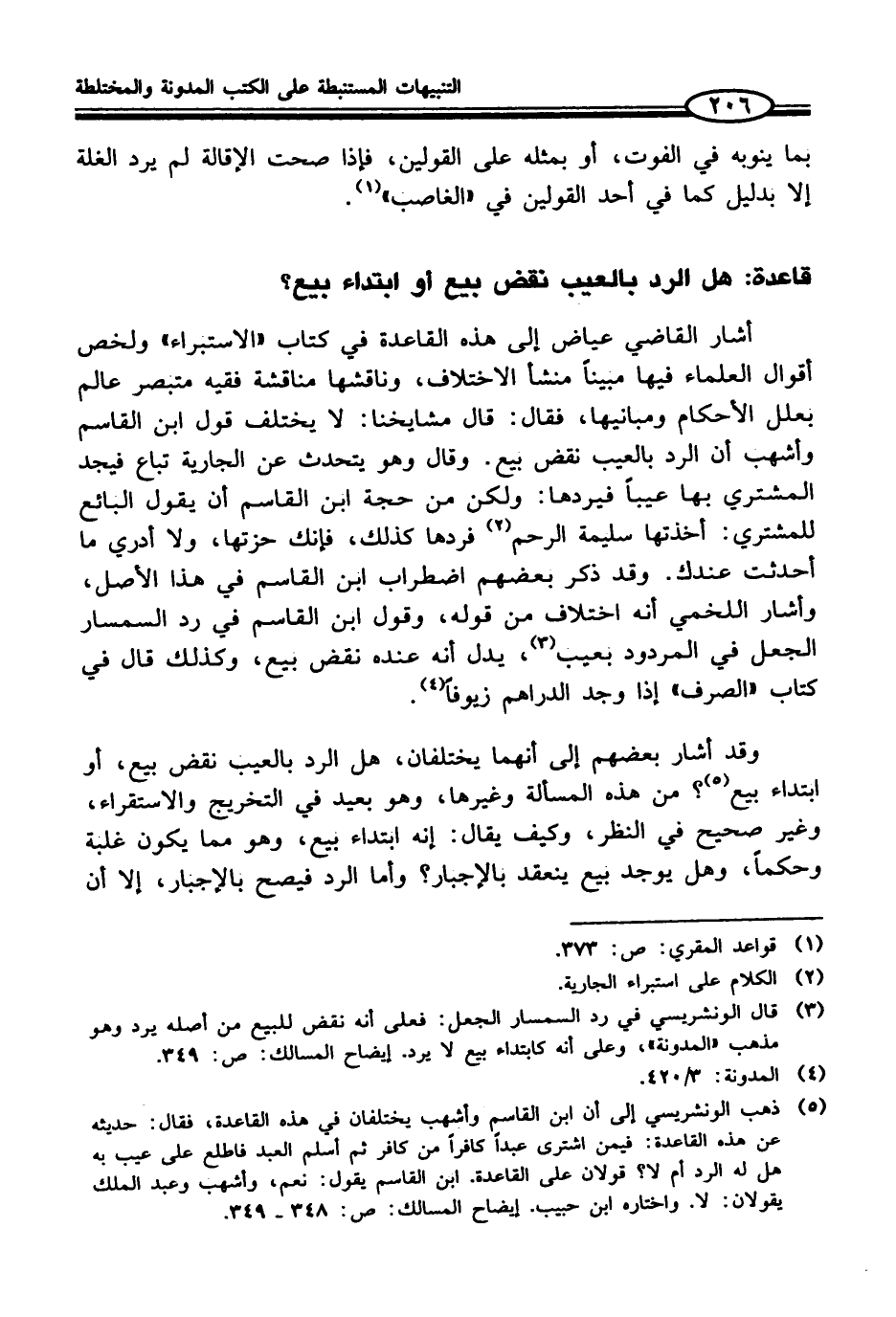 (¬5) ذهب الونشريسي إلى أن ابن القاسم وأشهب يختلفان في هذه القاعدة، فقال: حديثه عن هذه القاعدة: فيمن اشترى عبداً كافراً من كافر ثم أسلم العبد فاطلع على عيب به هل له الرد أم لا؟ قولان على القاعدة. ابن القاسم يقول: نعم، وأشهب وعبد الملك يقولان: لا. واختاره ابن حبيب. إيضاح المسالك: ص: 348 - 349.