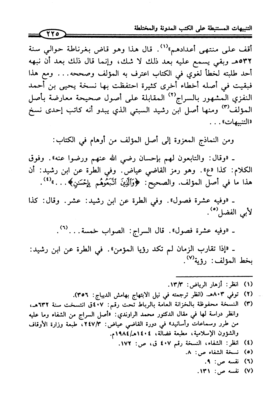 (¬3) النسخة محفوظة بالخزانة العامة بالرباط تحت رقم: 407 ق انتسخت سنة 632 هـ، وانظر دراسة لها في مقال الدكتور محمَّد الراوندي: "أصل السراج من الشفاء وما عليه من طرر وسماعات وأسانيد" في دورة القاضي عياض: 3/ 247، طبعة وزارة الأوقاف والشؤون الإسلامية، مطبعة فضالة، 1404 هـ/1984 م.