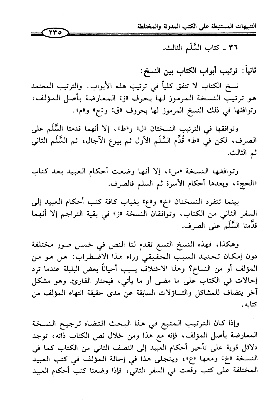 وإذا كان الترتيب المتبع في هذا البحث اقتضاه ترجيح النسخة المعارضة بأصل المؤلف، فإنه مع هذا ومن خلال نص الكتاب ذاته، توجد دلائل قوية على تأخير أحكام العبيد إلى النصف الثاني من الكتاب كما في النسخة "خ" ومعها "ع"، ويتجلى هذا في إحالة المؤلف في كتب العبيد المختلفة على كتب وقعت في السفر الثاني، فإذا وضعنا كتب أحكام العبيد
